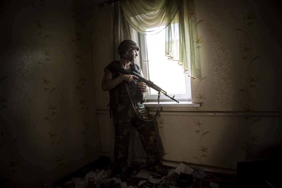 For these reasons in my last trip back in July I focused my attention on one of those villages, Spartak, and in particular on a group of fighters headquartered in an abandoned small building. Their mission was to spot enemies’ location and inform their fellow soldiers. I documented their daily routine and their life side by side with that of the civilians living next to their building, with a close interest on the human aspect of their actions. I tried to “undress ” the soldiers to highlight the men hiding beneath the uniform.