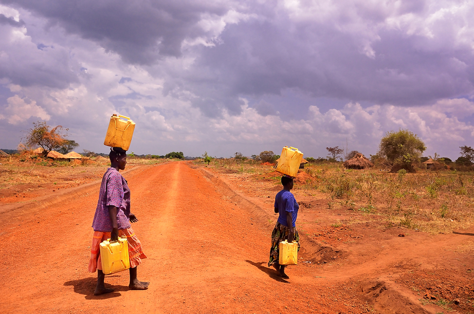 Two women in Northern Uganda carry water from a newly drilled wells in their hamlet. They walk to their huts across a newly built gravel road. Access to clean water and new roads are two of three legs of U.S. AID and Winrock International's $500 million NUDEIL construction projects in Northern Uganda. The impoverished region, now peaceful, is recovering from a long insurgency by Joseph Kony's the Lords Resistance Army. Accessible clean water can transform family health and free mothers' time for other economically productive activities. The new roads can mean easier travel to markets, safer travel to school for children, and easier access by health care workers and security forces.