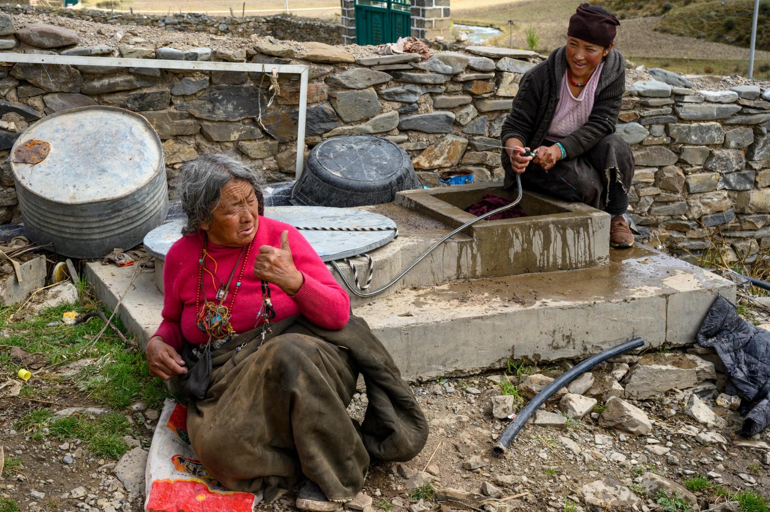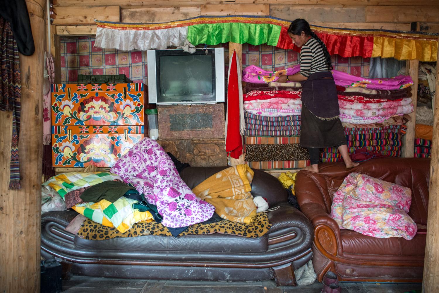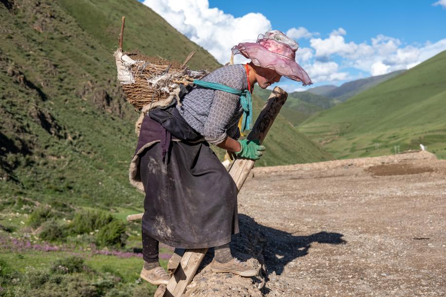 Jamyang Tsomo carries a handwoven basket filled with dirt up to the roof of her family’s home. After she has removed weeds and stones from the roof, she fills the dips and holes to prevent water leaks or collapse. Besides her mother, Jamyang Tsomo is the only woman in the household responsible for most of the domestic duties.