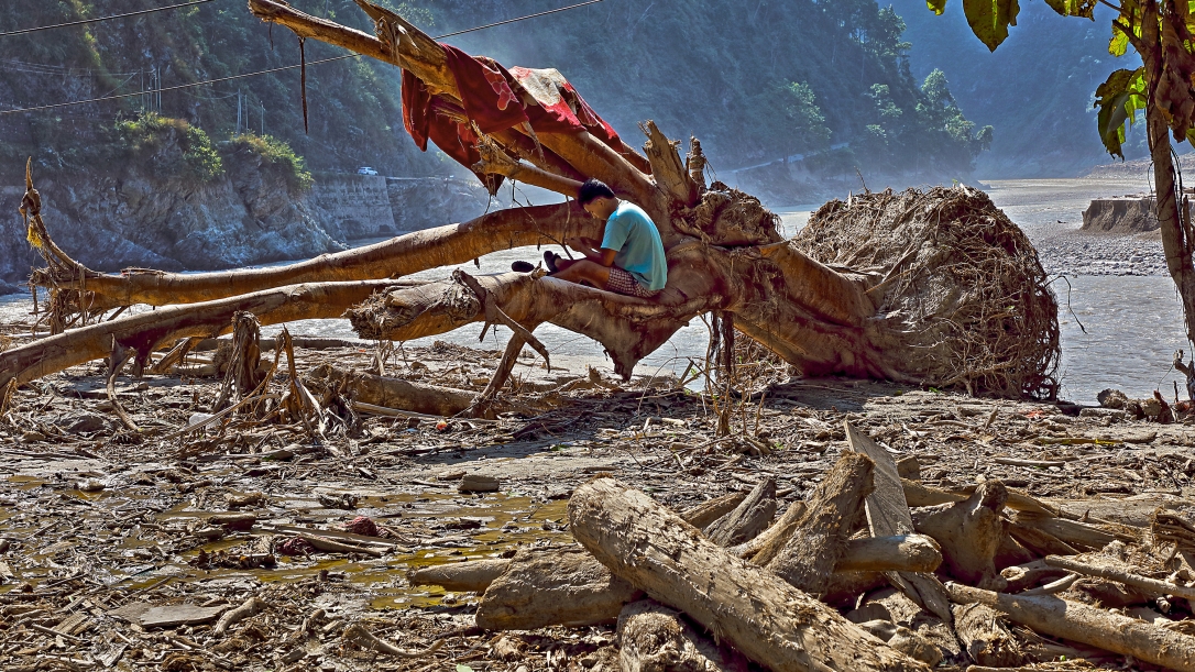 In this image, a student lazily browses thru his cell phone while sitting on a massive tree trunk which the GLOF brought down to his home. His home was badly damaged by the floods and their TV/ refrigerator/ other domestic tools lay around covered in sand and soil - the whole area was littered with tree trunks and sand.