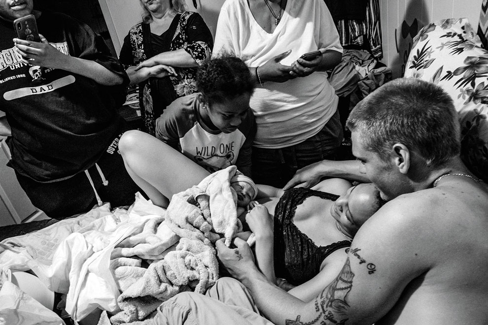 Chloe has arrived after four short hours of labor. Michaela is surrounded by her husband Zach Holmes, son, mother, mother-in-law, and sister. Michaela was determined to create the birth experience she wanted which included being surrounded by family and friends. Photo by Benita Mayo.
