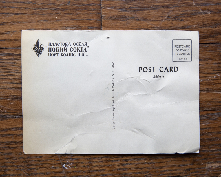 The postcard reads: Plast Camp Novyi Sokil, North Collins, N.Y. The camp was started in 1950 by Siryy Lev and Marian Borachok, Plast leaders displaced from Ukraine to Buffalo, N.Y. They found an abandoned farm for camping in the nearby rural village of North Collins. In 1950, it had a population of under 2,000 people, and today, close to 3,500. With the help of neighboring communities in Rochester, N.Y., and Cleveland, Ohio, these Plast Scouts, or “Plastuny,” purchased the land in 1951 for $2,500, officially marking Novyi Sokil as the first Plast camp in the United States.