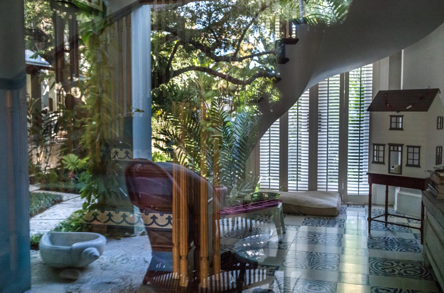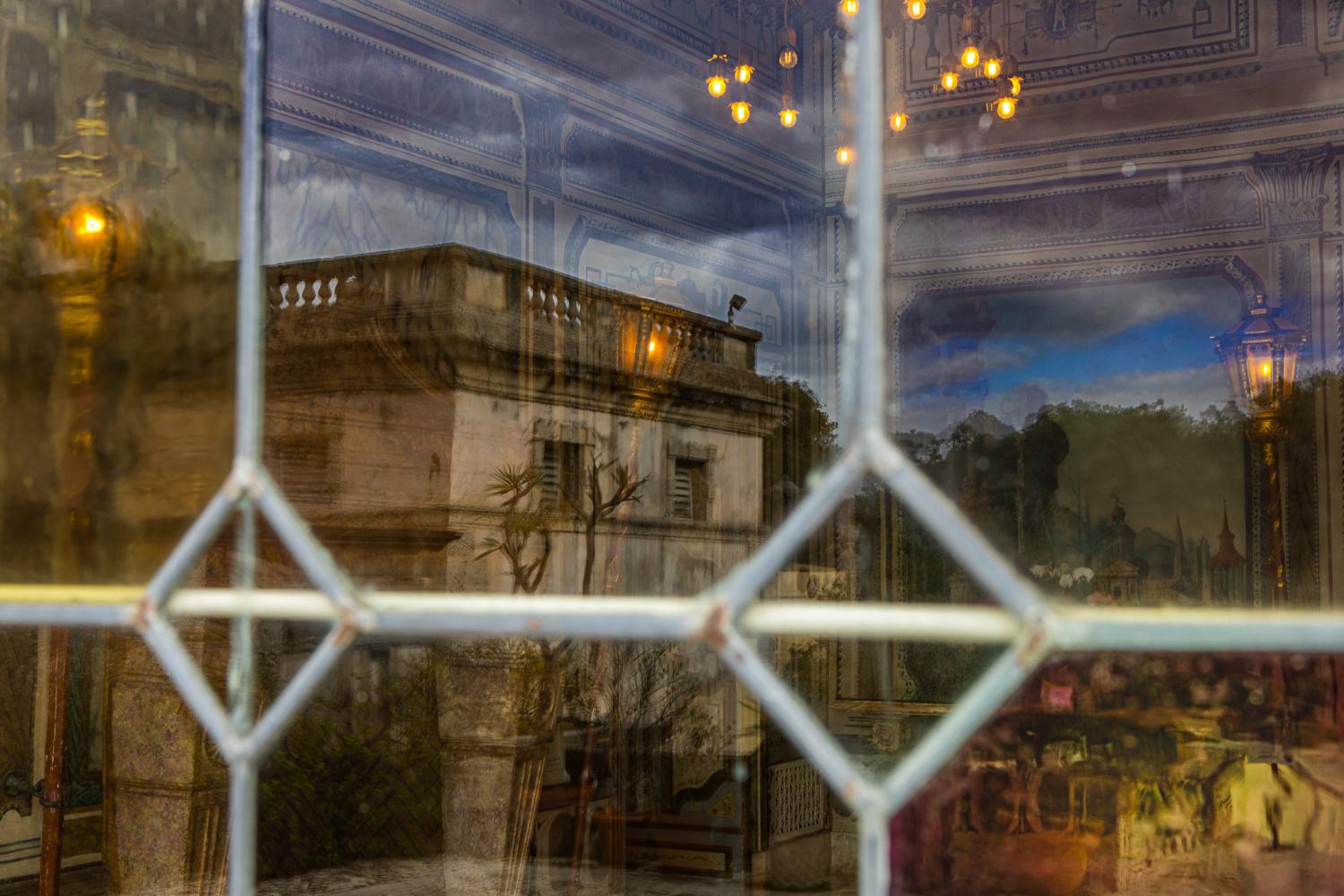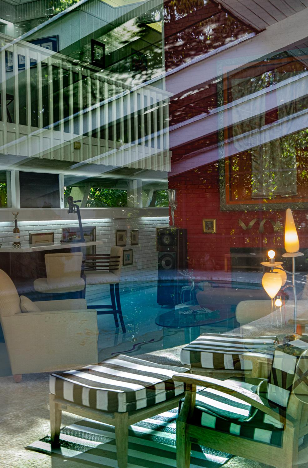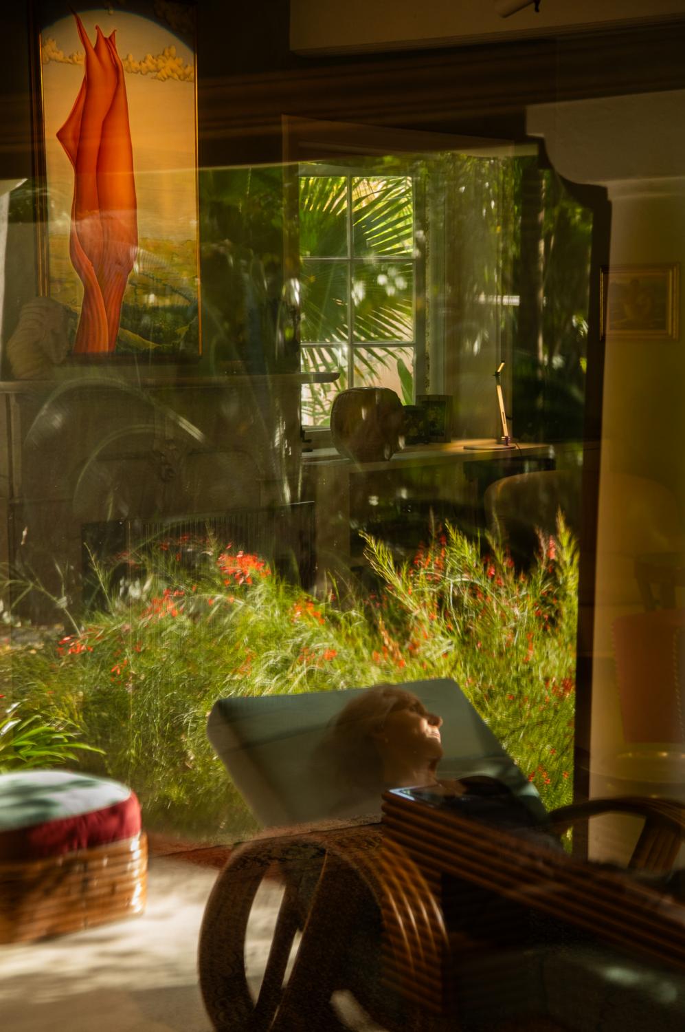These photographs of reflections convey my way of experiencing life at that time. The mixture of the garden blooming and flowing into the house; the vibrant colors from the trees, palms and sky was a ghostly mixture melting into the interiors. The photographs make sense to me and are a metaphor for the way my brain was functioning. Now these photographs ar a festive and sublime way to look at life.