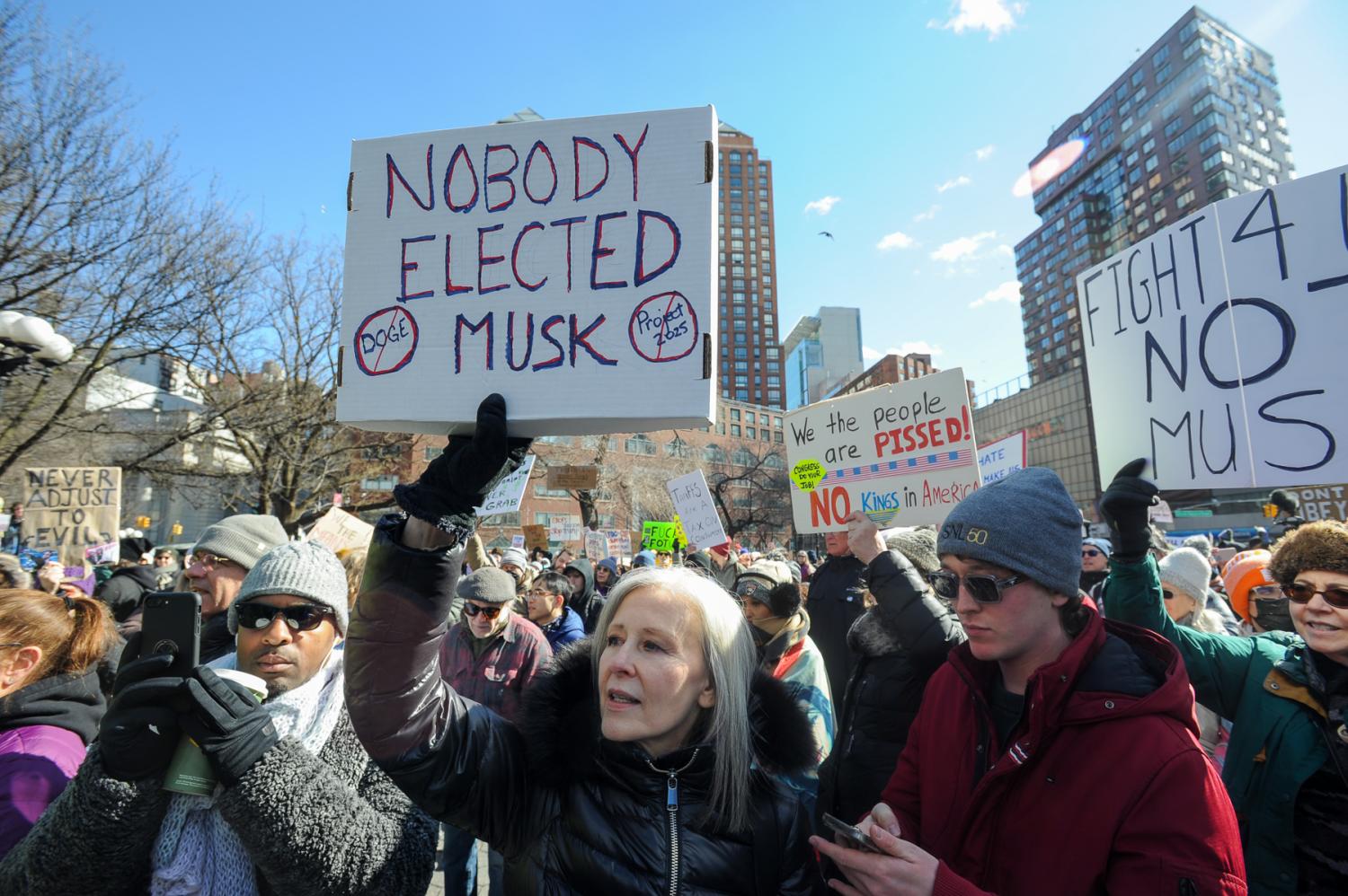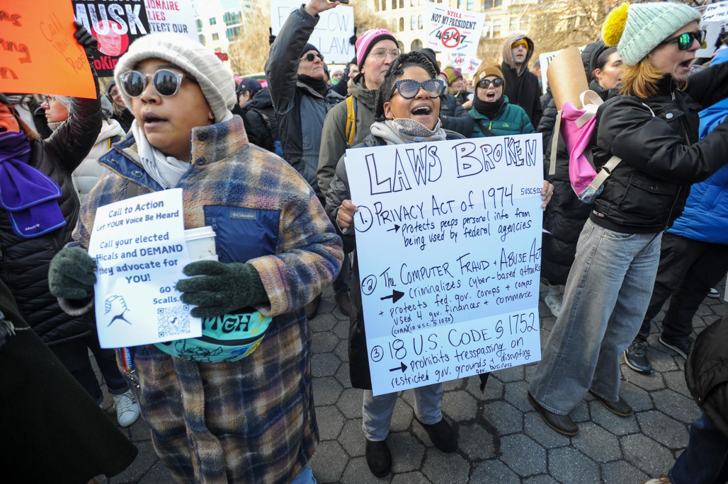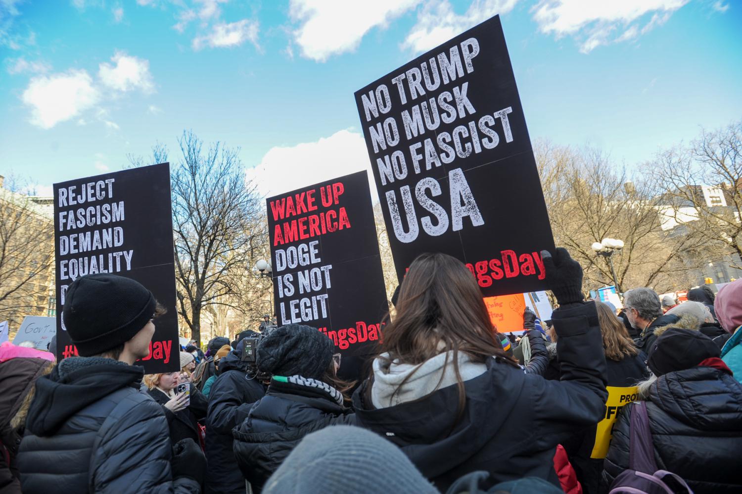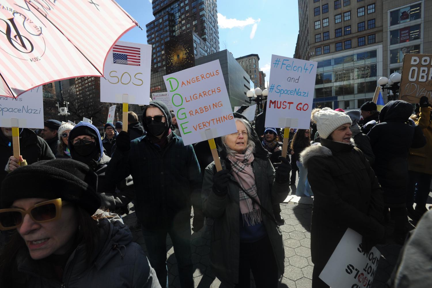 On President’s Day, February 17, 2025, in honor of the United States first President, George Washington’s birthday, a national holiday, organizers of the NYC: Resist the Dictator on Presidents Day with Target Majority NYC & Rise And Resist, staged a protest march in New York City. Held at Union Square Park, in New York City. Several thousand people arrived, many carrying signs, placards and other materials enlisted to show support against President Donald Trump and the Billionaire Tech titan and world’s richest man, Elon Musk and their collective policies to transform the United States government into a fascist state.