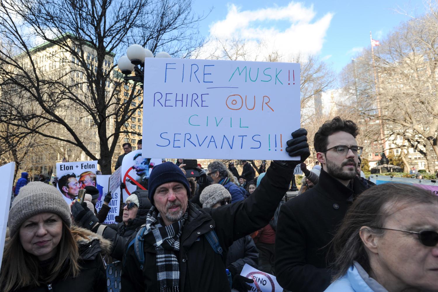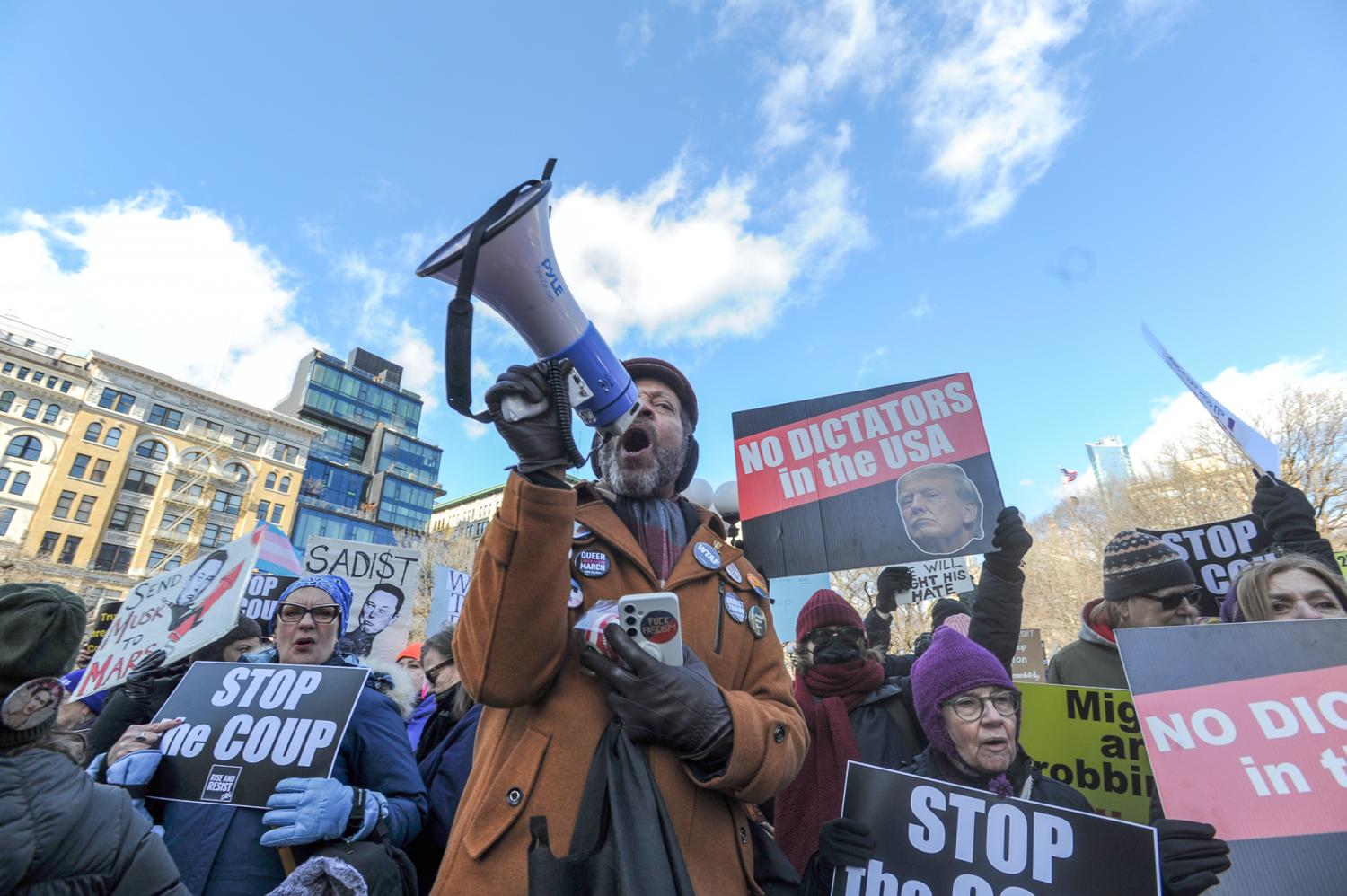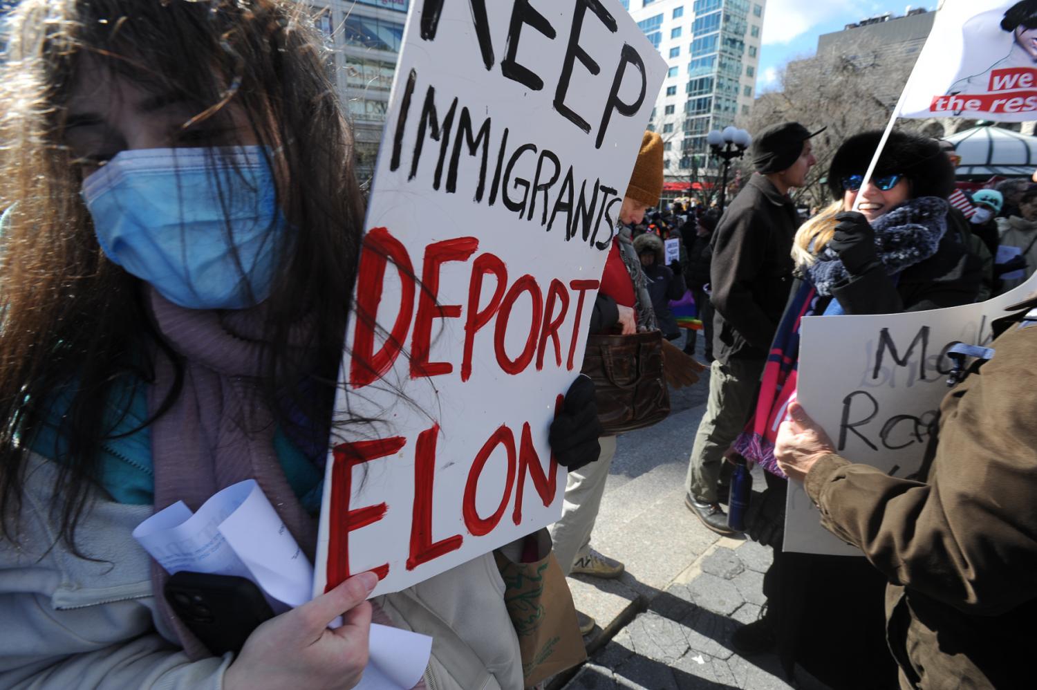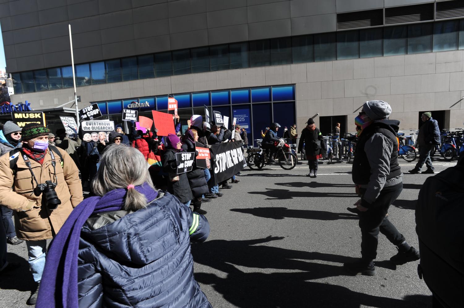 On President’s Day, February 17, 2025, in honor of the United States first President, George Washington’s birthday, a national holiday, organizers of the NYC: Resist the Dictator on Presidents Day with Target Majority NYC & Rise And Resist, staged a protest march in New York City. Held at Union Square Park, in New York City. Several thousand people arrived, many carrying signs, placards and other materials enlisted to show support against President Donald Trump and the Billionaire Tech titan and world’s richest man, Elon Musk and their collective policies to transform the United States government into a fascist state.