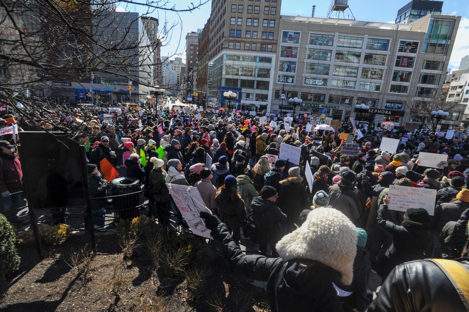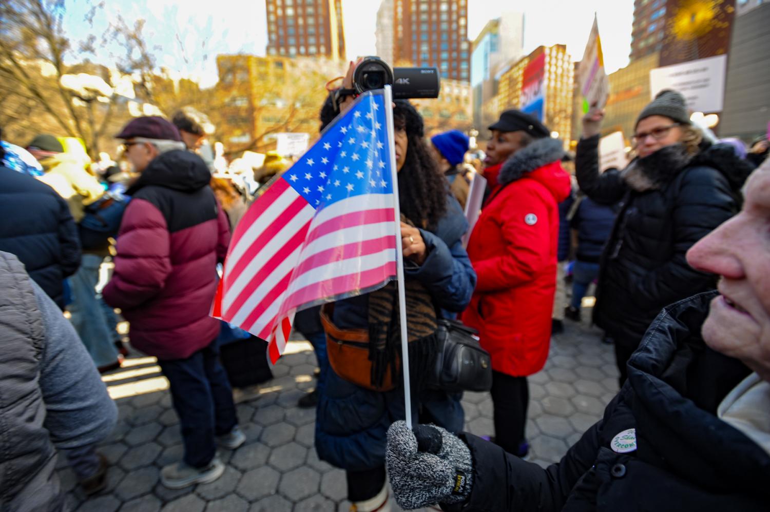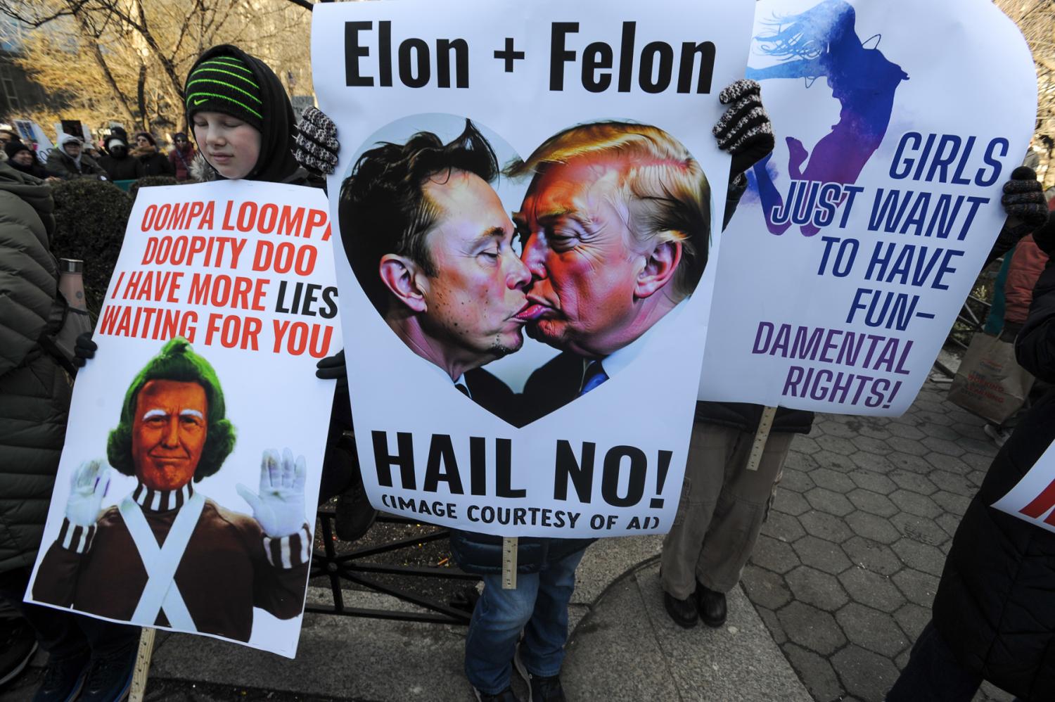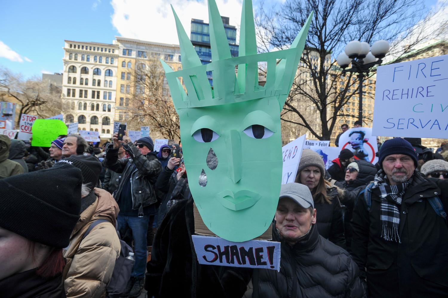 On President’s Day, February 17, 2025, in honor of the United States first President, George Washington’s birthday, a national holiday, organizers of the NYC: Resist the Dictator on Presidents Day with Target Majority NYC & Rise And Resist, staged a protest march in New York City. Held at Union Square Park, in New York City. Several thousand people arrived, many carrying signs, placards and other materials enlisted to show support against President Donald Trump and the Billionaire Tech titan and world’s richest man, Elon Musk and their collective policies to transform the United States government into a fascist state.