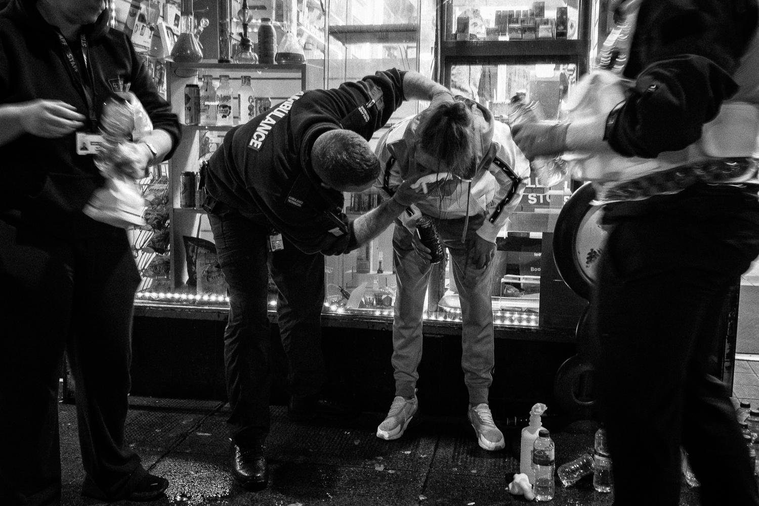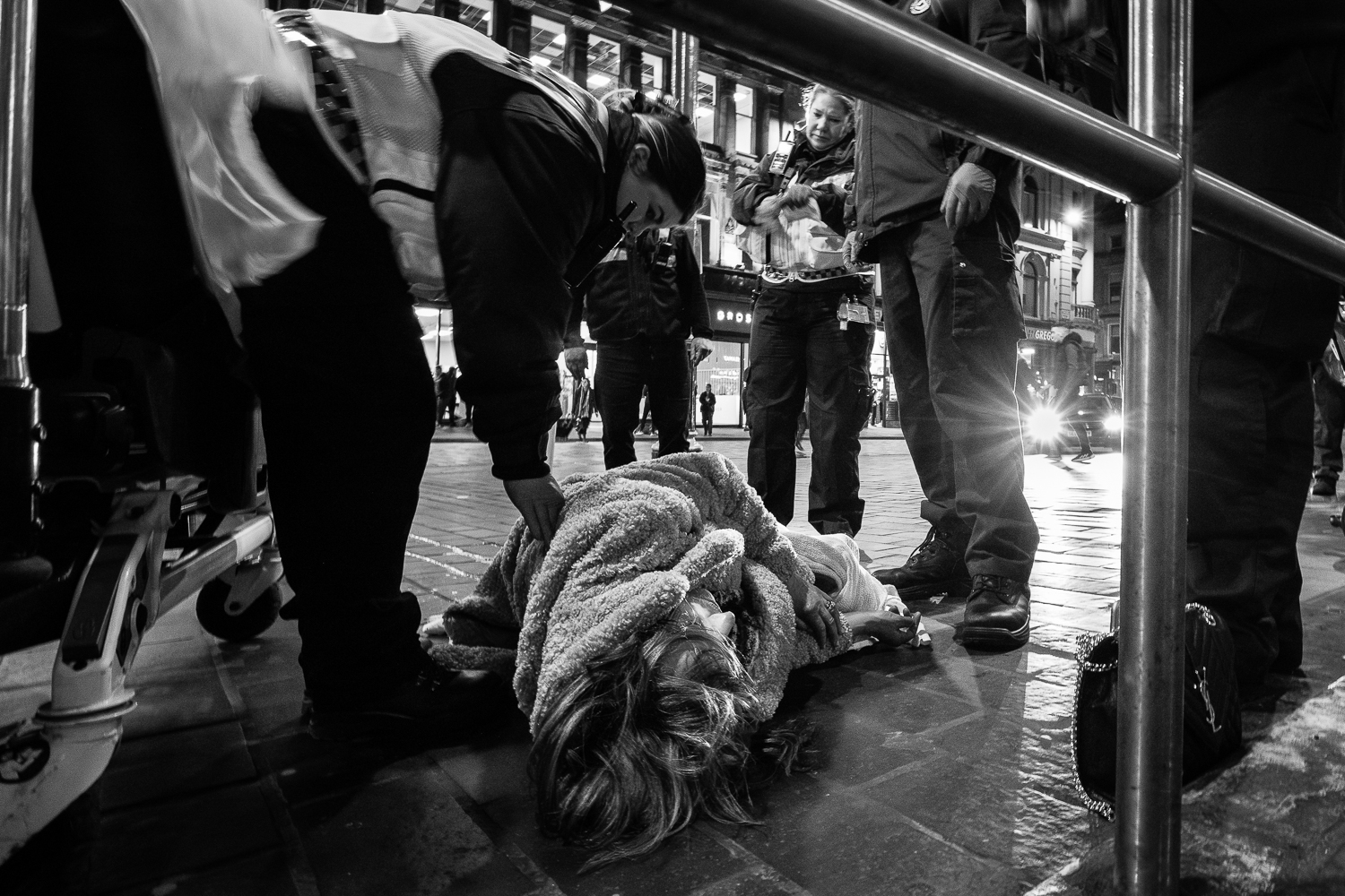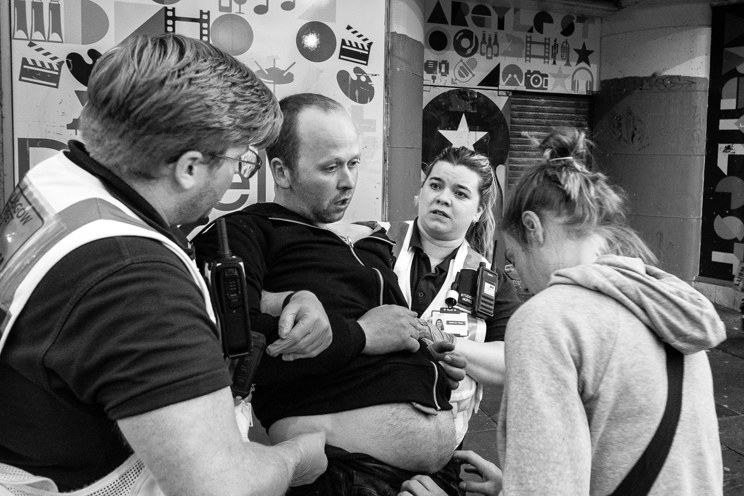 Glasgow Street Aid is a charity set up and staffed by medical professionals whose aim is to provide first response assistance to those in need in Glasgow city centre during weekend nights. As a charity they rely solely on donations and fundraising efforts to finance their operations and yet they provide vital emergency services normally reserved for the ambulance service and accident and emergency departments at hospital, annually preventing thousands of cases impacting the wider Scottish National Health Service. Beyond immediate medical needs they provide other vital services such as mental health support and needle exchange. They operate from a base in the city centre which houses fully equipped emergency treatment bays and a control centre and they have their own private ambulance. I have been documenting their work for nearly two years now, which involves shadowing the two-person crews as they patrol the streets of Glasgow city centre at night. The photography is used for educational purposes in lectures, social media feeds and newsletters and helps illustrate the remarkable work carried out by this dedicated team, something that words alone cannot do justice to.