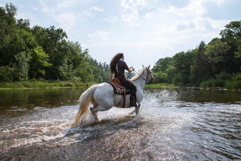 Kiley Knowles rides her horse through the Shell River in northern Minnesota during a "Women Water Protectors" demonstration against Line 3. According to a 2021 report from Indigenous Environmental Network and Oil Change International, Indigenous resistance against fossil fuel infrastructure projects over the last decade has stopped or delayed greenhouse gas pollution equivalent to at least one-quarter of annual U.S. and Canadian emissions (1.8 billion metric tons of carbon dioxide). July 15, 2021.
