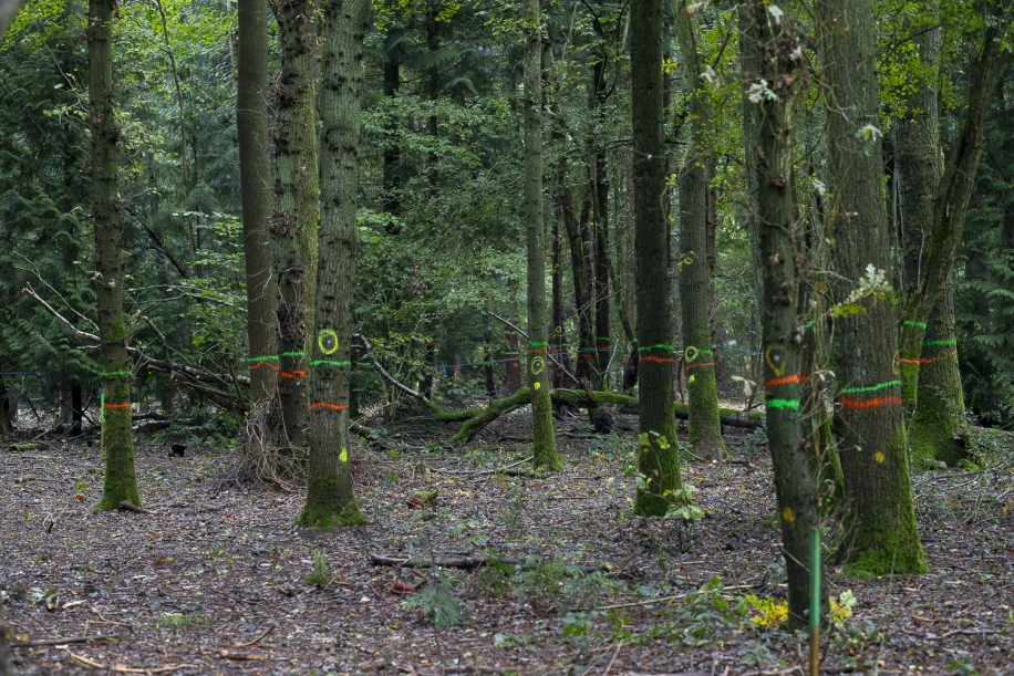 MARKED FOR DESTRUCTION Trees at South Cubbington Wood, part of the Princethorpe Woods complex, marked with paint for felling. The woods were the largest concentration of semi-natural ancient woodland in the Midlands, home to the rare Wild Service trees, seven species of bats, wood anemones, numerous butterflies and ground-nesting skylarks. It was also home to a locally famous 250-year-old wild pear tree which had been voted Tree of the Year. The tree, despite national protest was torn down by the consortium shortly after this picture was taken in October 2020, along with these trees. South Cubbington Wood, October 2020