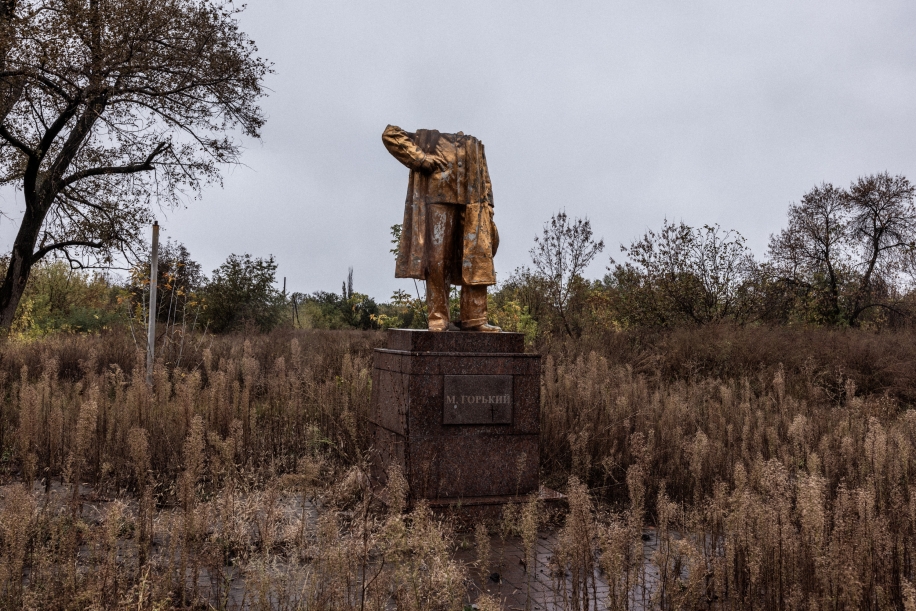 A decapitated statue of Russian writer Maxim Gorky stands in the city centre of Chasiv Yar on October 8, 2023, Donetsk region, Ukraine. The statue has allegedly been destroyed by Russian shelling. Chasiv Yar overlooks the highly contested city of Bakhmut, and it has been a vital military logistical hub since the start of the full-scale invasion. It is strategically positioned on the hills and is now a target for Russian forces; street battles are already occurring. The town represent the last elevated positions before Kramatorsk, Kostiantynivka and Sloviansk, important cities for Ukraine where a series of roads and railways connect the Donetsk region with the rest of the country.