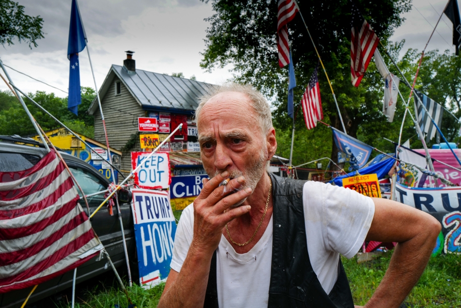The first time I passed Tommy's house in the Shenandoah Valley, I couldn't believe what I saw. Big, colorful homemade Trump signs littered his yard and adorned the sides of his dilapidated house. Once, when I stopped my car to take photos, he yelled from a distance, asking if I were a Trump lover too. I peeled away, fearing his mental state. Two years later, and countless trips past his house, I read in the news there was a fire in his home. On my next trip, I stopped by the nearby gas station and bought some fried chicken for him. Since then, I've visited him many times. And through our interactions, I've tried to understand why he loves Trump. And by that, I hoped to understand why anyone would be Waiting for Trump.