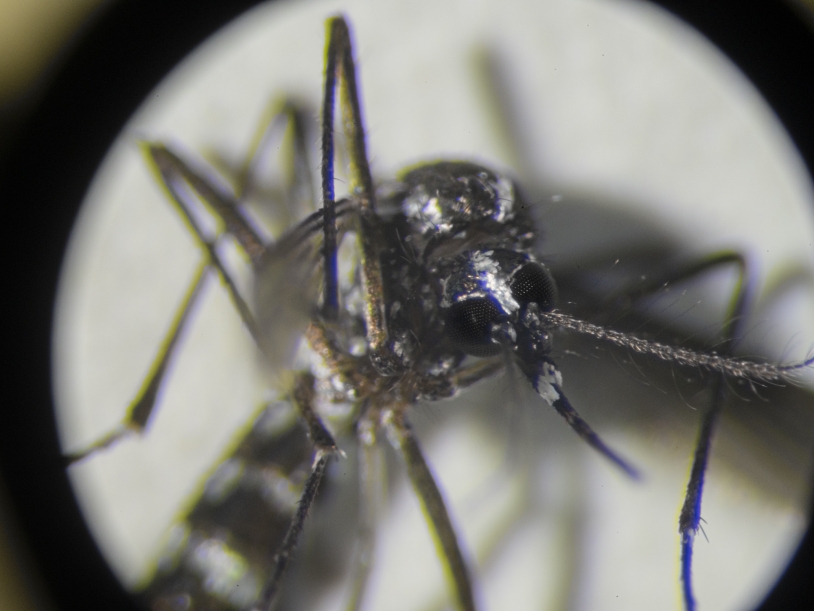 Italy. Rome. ENEA research centre. Close up of tiger mosquito under the microscope. The method tested by the ENEA research center is not based on genetic modifications but on the manipulation of the natural bacterial flora of the insect reproductive system, using bacterial strains already commonly spread in the environment and absolutely harmless to humans. In practice, through the administration of an antibiotic, the Wolbachia bacterium is removed from the cells of the reproductive tissue of the tiger mosquito and is replaced, via embryonic microinjection, by different variants of the same bacterium taken from the fruit fly.