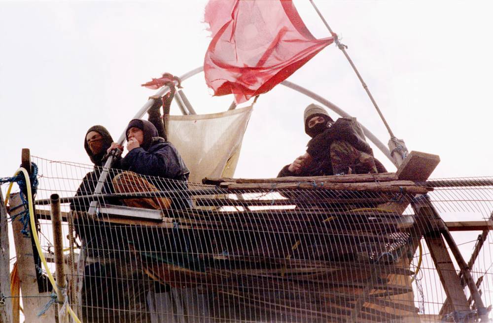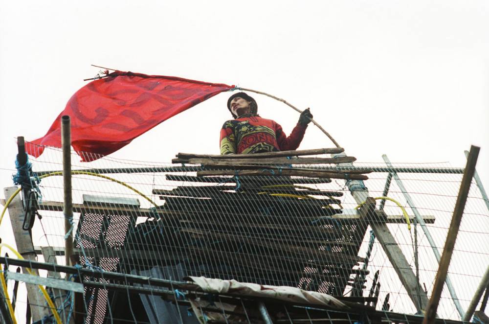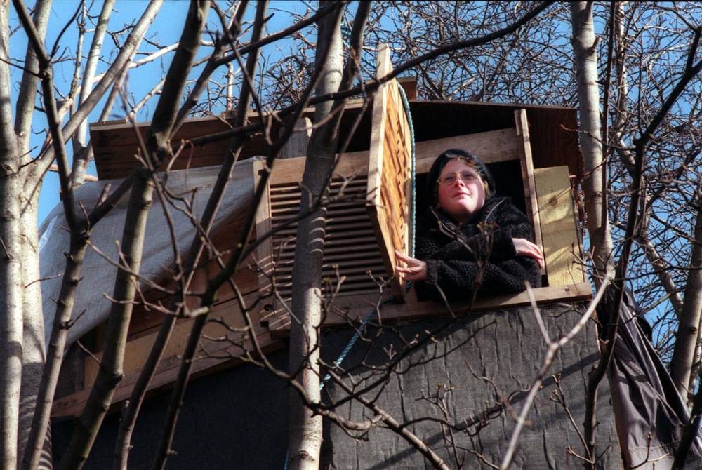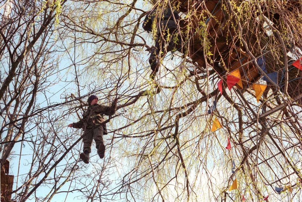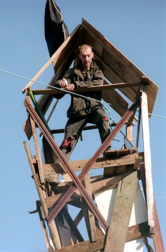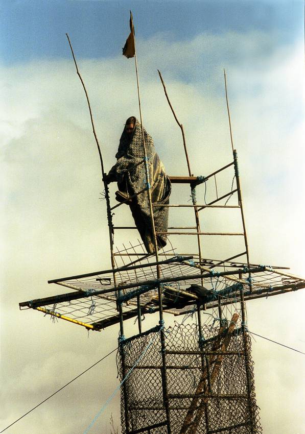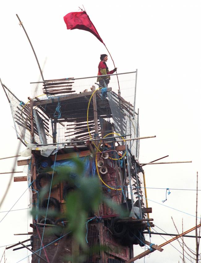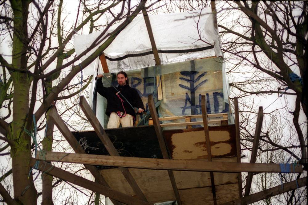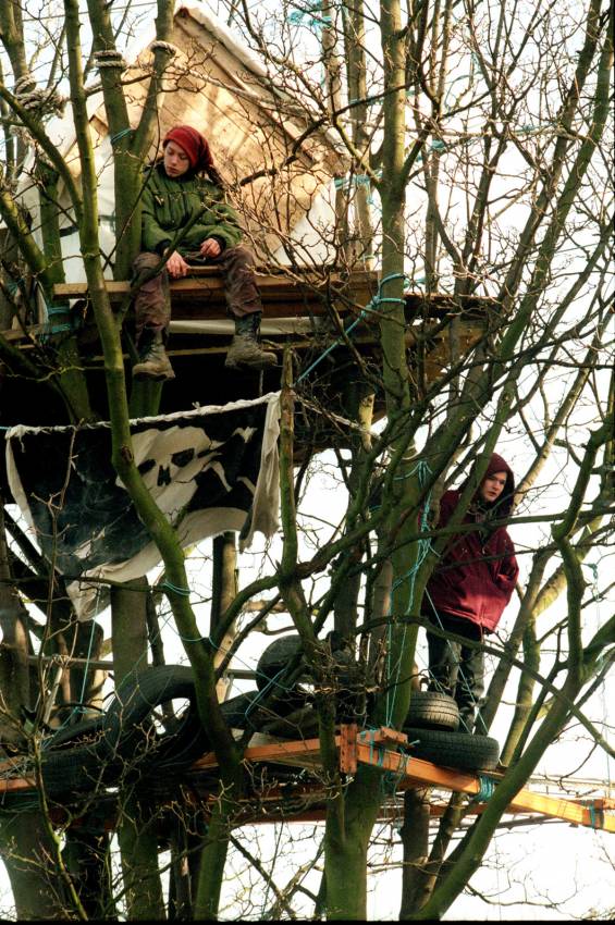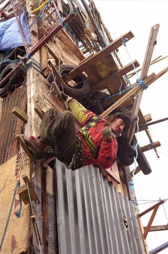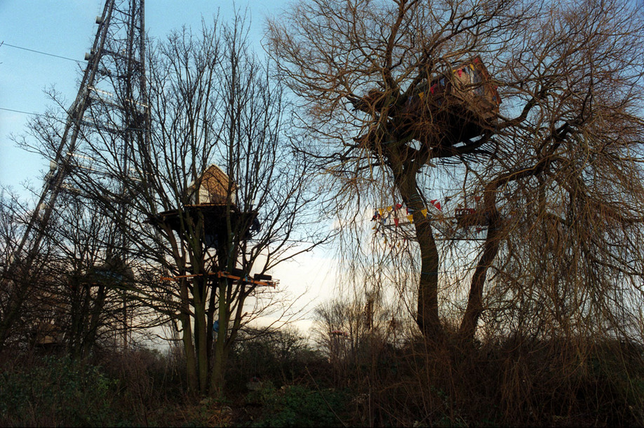 For a year and a half a group of Eco Warriors squatted in public parkland in Crystal Palace the highest point in South London. Protesting the proposed building of a £58m leisure complex which would both take away parkland and devestate the wildlife, they constructed and lived in makeshift tree houses and creative structures made with scaffolding poles. Rope walkways connected the tree houses and also provided escape routes when the ballifs moved in to evict the camp.
