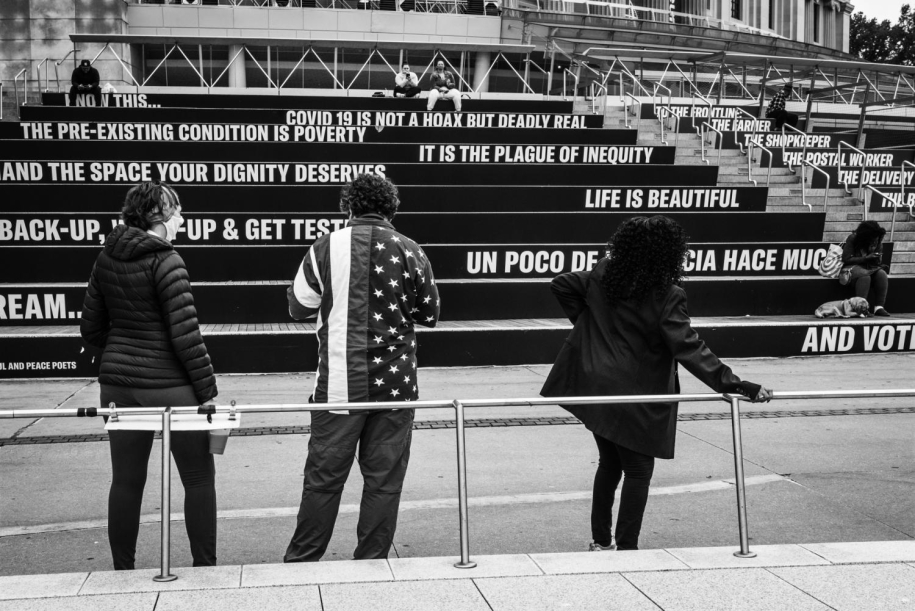 The 2020 presidential election felt consequential to a degree unmatched by any other in my lifetime.These images have their origin as part of a larger body of work documenting the initial year of the pandemic.As the election grew near, I set out to document the determination of my Brooklyn neighbors to exercise their right to vote.While the winner of the presidential contest in New York State was never in doubt, we now know just how closely the nation came to a subversion of the peaceful transition of power through a violent coup - a threat to the fundamental heart of American democracy.These images begin on the first day of early voting at the Brooklyn Museum, continue with images made at Brooklyn’s Grand Army Plaza on the day the election was called for Joe Biden and Kamala Harris and at a January demonstration outside the Bay Ridge office of Congresswoman Nicole Malliotakis who voted to overturn election results in Arizona and Pennsylvania, and end with the inauguration of President Biden.
