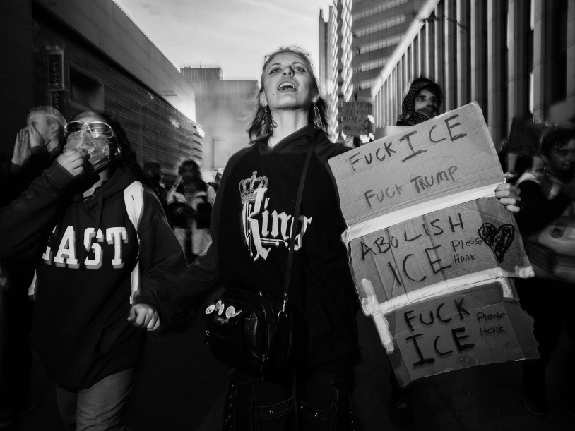 Pleading the First is a look at what it feels like when people step into the street and use their voices. These photographs come from protests during the Trump administration in 2025 and 2026, when crowds gathered with signs in their hands and hope or frustration in their eyes. I tried to stand in the middle of it all with a steady heart, paying attention to small things like the way someone held a friend’s arm or the quiet moments before a chant began. I wanted to honor the people who showed up, along with the officers and neighbors who stood nearby. What I saw was the First Amendment lived out in real time. Not an idea on paper, but something carried by ordinary people who believed their presence mattered. This work is my way of remembering them with gratitude and care.