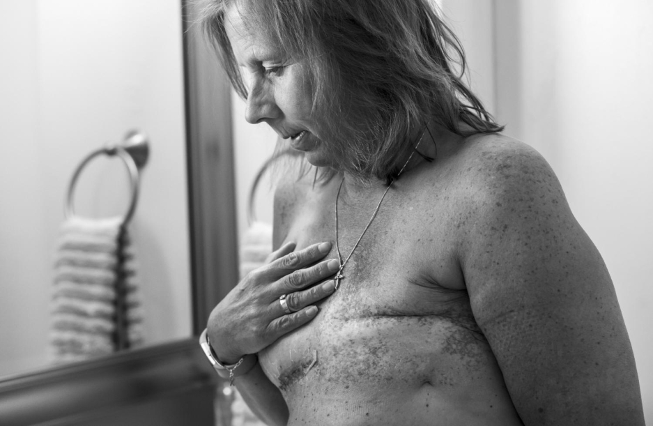 Sandy Holden in the bathroom of her home in Westwood, California. Sandy had a mastectomy, chemotherapy and radiation therapy after being diagnosed with Stage 3 breast cancer. Like many women Sandy did not realize that breast reconstruction surgery was covered by insurance after a mastectomy. Sandy eventually looked into that option because it made her sad to see her scars in the mirror every morning.