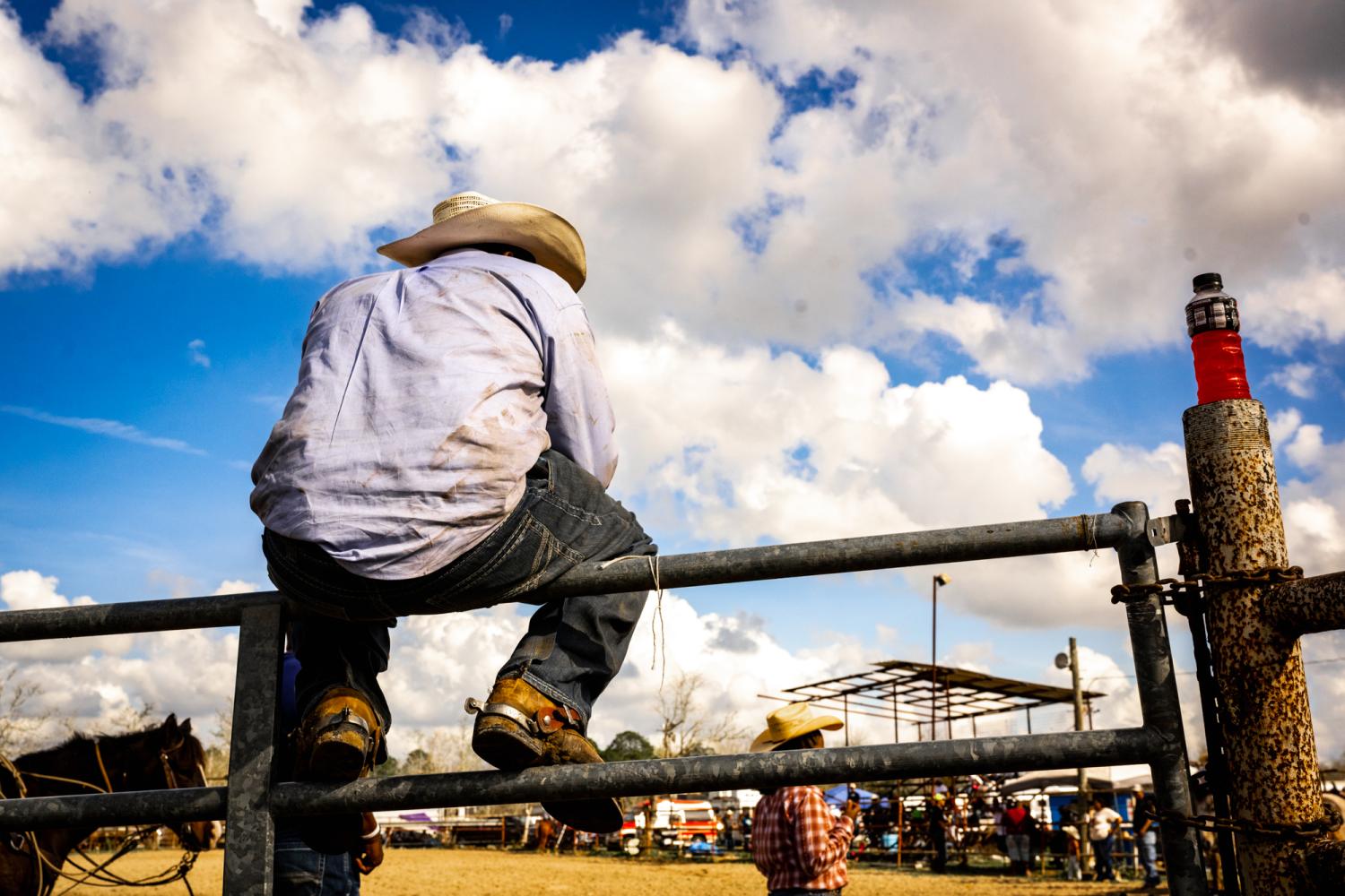 Brock Taylor and Wyatt Raymond await their turn at a" Jackpot" rodeo, this one held at the backyard arena of Ashton "Bud" Simeon. In Cheek, many of the cowboys maintain small family arenas on their property, and share them freely with any and all neighbors. Jackpots are neighborhood rodeos where cowboys kick in a small amount of cash, and compete to take home the pot.