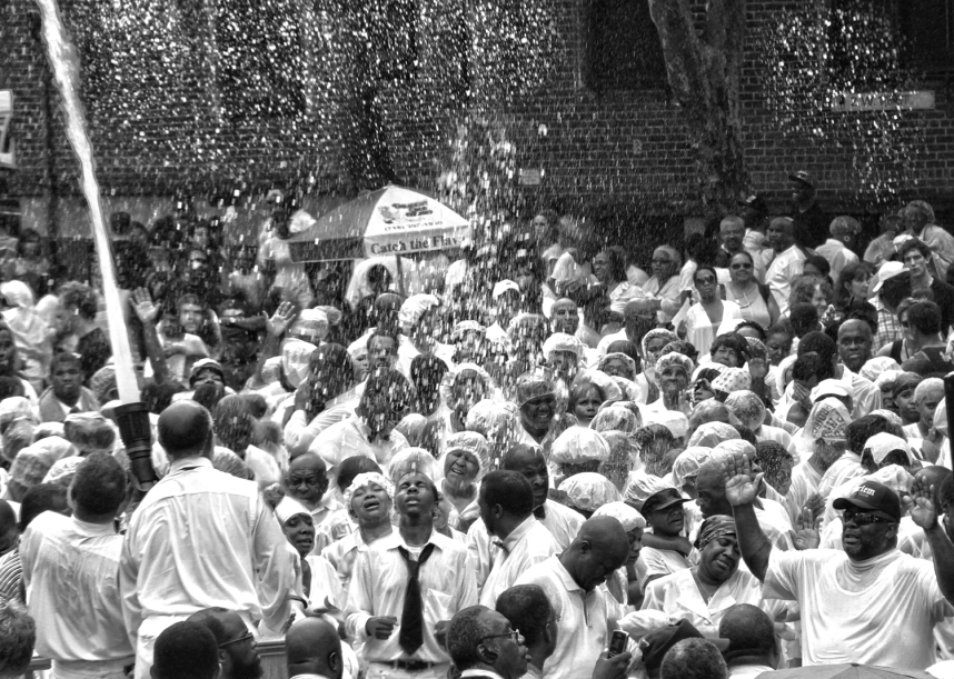 Since the dawn of time, water that naturally arose from the earth was revered and used for baptisms. Today, the fire hose is the modern delivery system that forces underground water to arise as Holy water to sanctify Harlem's streets and baptize the devotees.