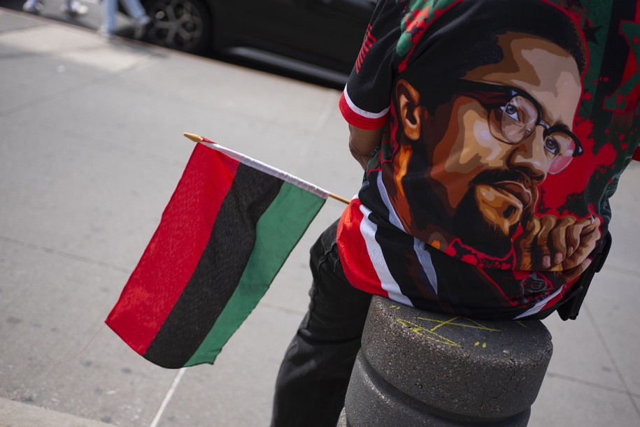 The image of Malcolm X was seen on tee shirts, caps and posters on May 18th at the Malcolm X birthday parade. The colors of the African American flag flies for all people of African decent. Red stands for the blood shed during slavery, black symbolizes the color of African people, and green is for the green landscape in Africa.
