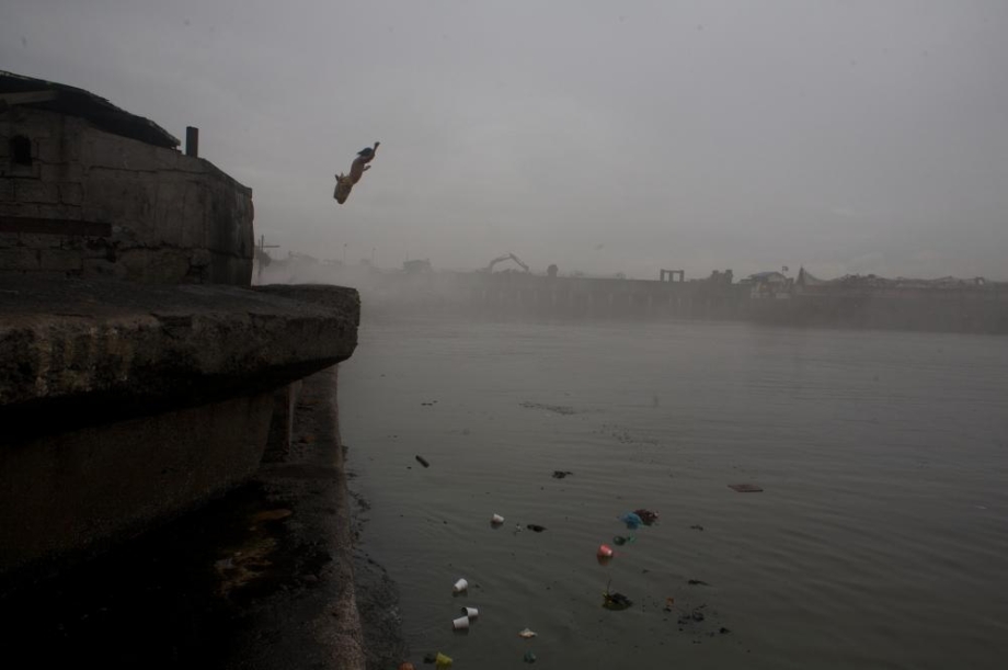 A young girl jumping into the polluted Pasig river after working the charcoal pits in the squatter community in the North Harbour of Manila, where families work as Ulingeros, or charcoal workers. Many of the workers in Ulingan are small children. Some are teenagers and a few were even as young as six or seven, unable to attend school because of poverty.