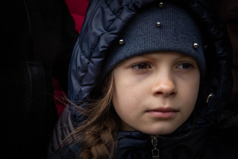 Hundreds of people gather in the rain outside of a school turned resource center in Odesa, Ukraine. Here they will be registered and helped with an array of needs. People can have a warm meal, or get clothing or other items they may not have been able to take with them when they fled, get assistance with housing or transportation to another destination, or receive medical care. Most have arrived by train and fled continued fighting in the Donbass, Kharkiv, Mykolayiv, and villages in the east.
