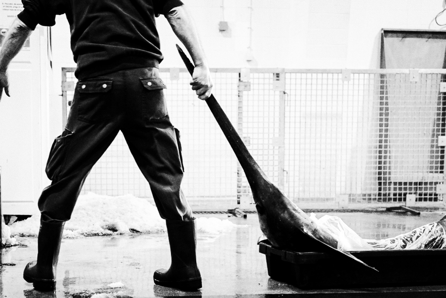 Swordfish being prepared for auction in Lota de Sesimbra - Fish port and auctions, which is one of the most important in mainland Portugal and is the fish landing and sale area for the species captured by the local fleets. Docapesca is a state-owned company under the Ministry of Agriculture, Sea and Environment . It provides the public service of organising the sale of fish and supports the fishing and fishing ports sector.