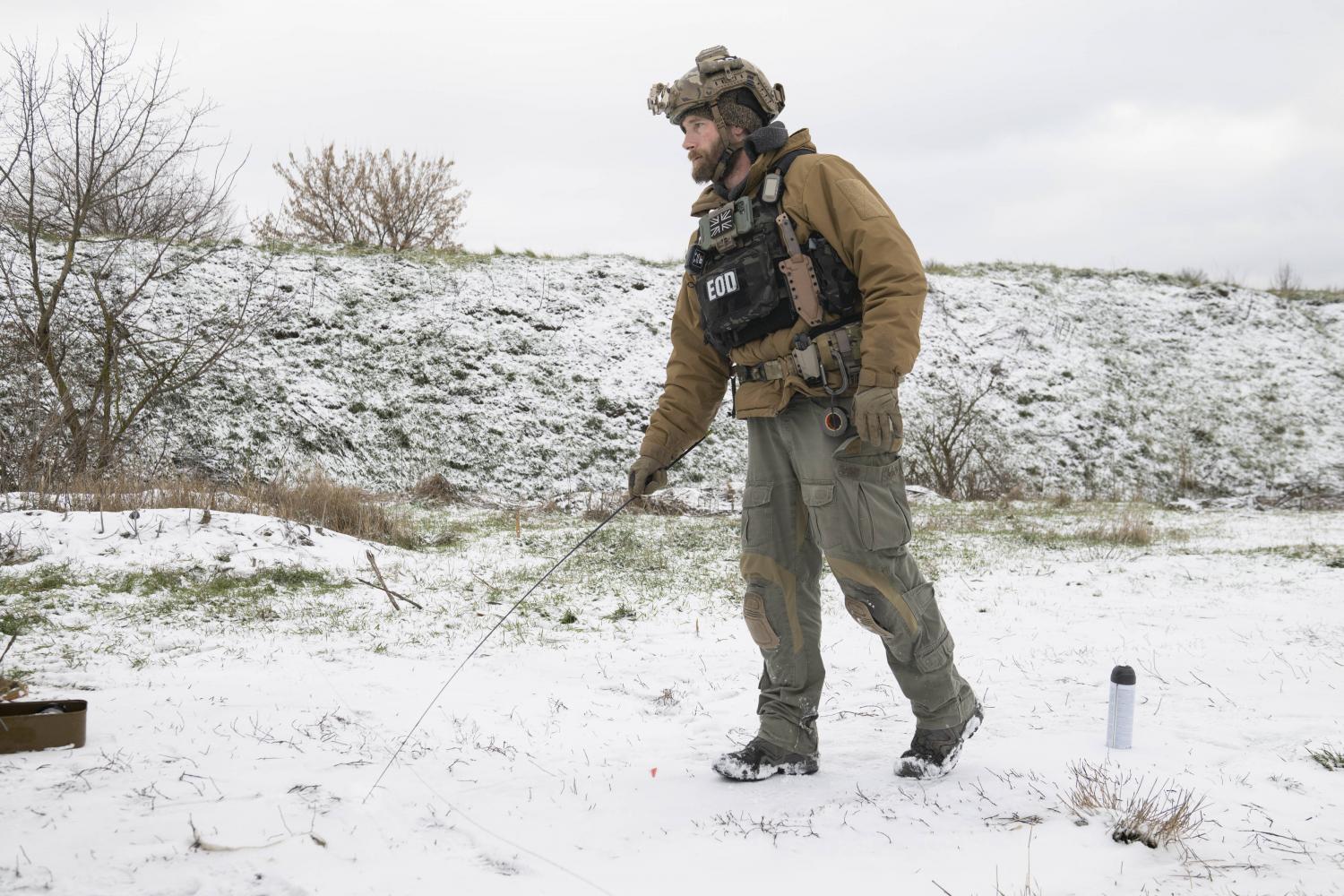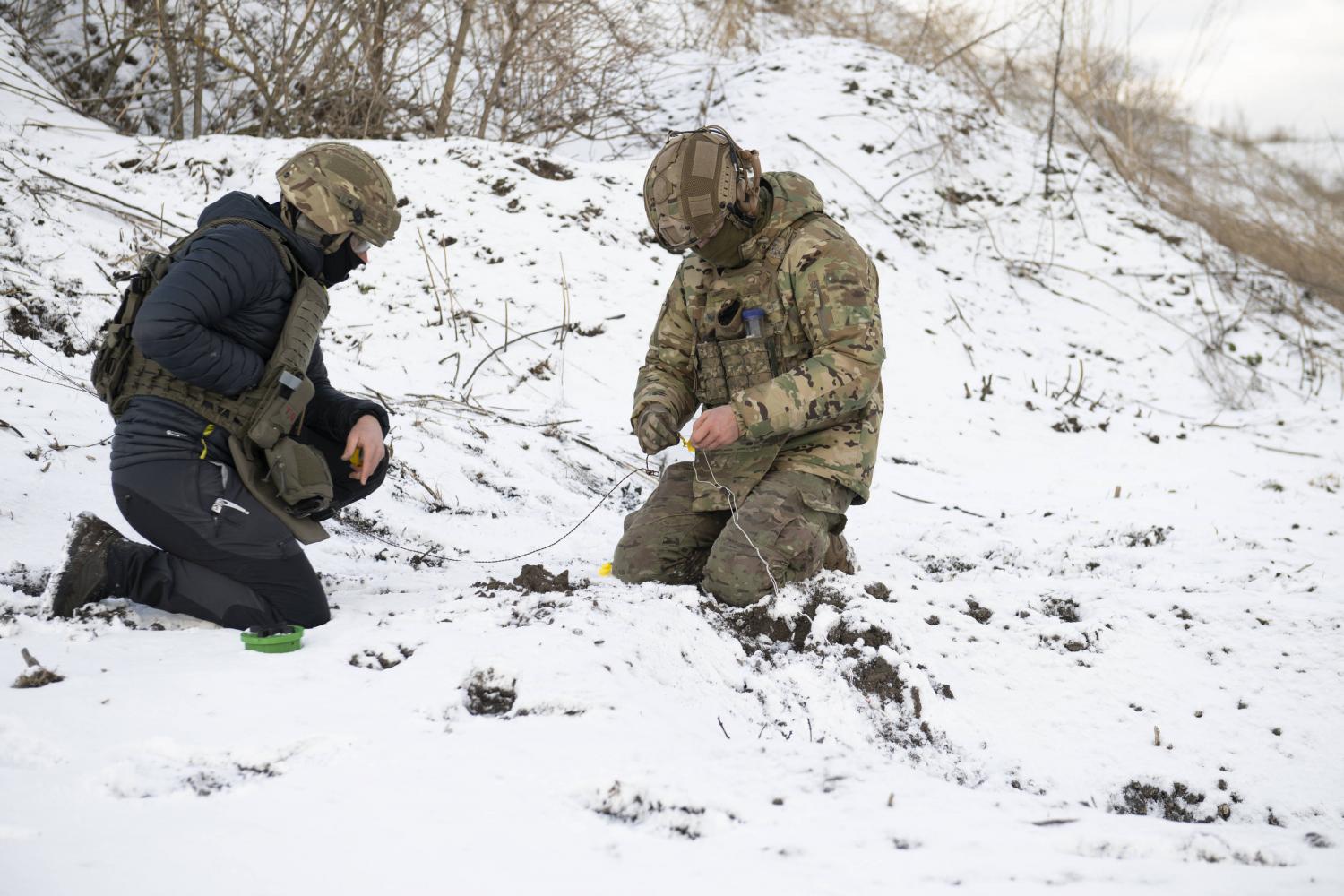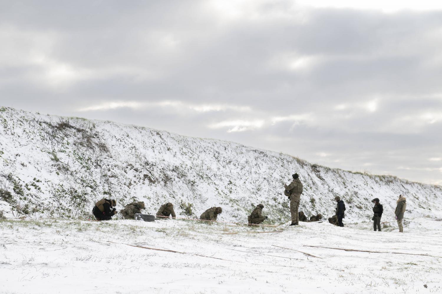 Government agencies preparing to go to the frontlines in Ukraine, receive on-site training by volunteers of Prevail Together, a not-for-profit organization that provides free Explosive Ordinance Disposal (EOD) training, landmine clearance and medical support to government agencies. Undisclosed location, Ukraine. Dec. 12, 2024.