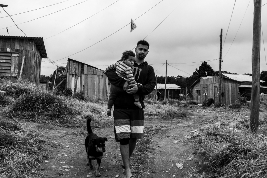 Admilson de Moura walks along a dirt road in the Parque dos Lagos occupation carrying his son, Arthur. Unable to afford rent, he has lived with his family in the occupation for four years and has already faced eviction threats. “My wish is to see the land regularized so we can live in peace and have access to water, electricity, and basic infrastructure,” Admilson says.