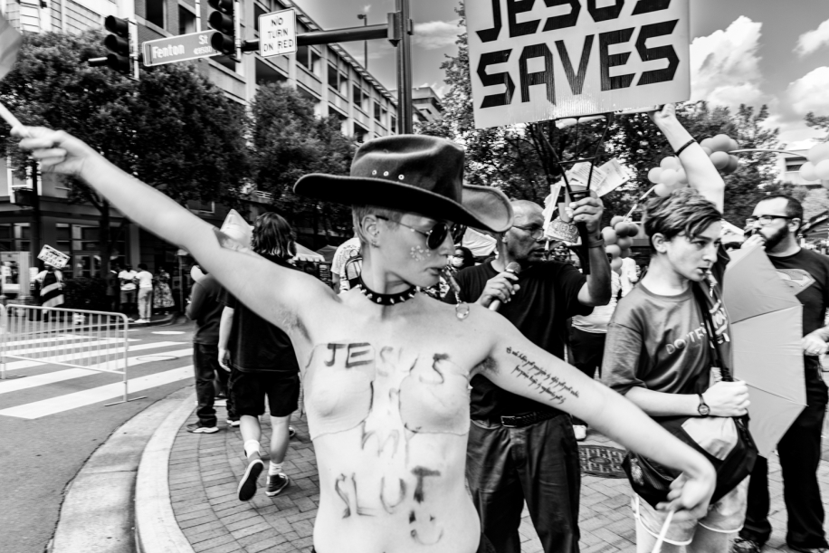 June 25, 2023. At the Pride Festival in Silver Spring, Maryland, a street corner is infiltrated by evangelistic priests.With sound speakers at a deafening pitch, they preach that Pride attendees will face hell and damnation, yet they hide their faces behind bibles. It becomes a battle of sound and song as the LGBTQ+ crowd dances and sings to drown out the priests’ messages of hate and sin. They are successful as many in the crowd join them.