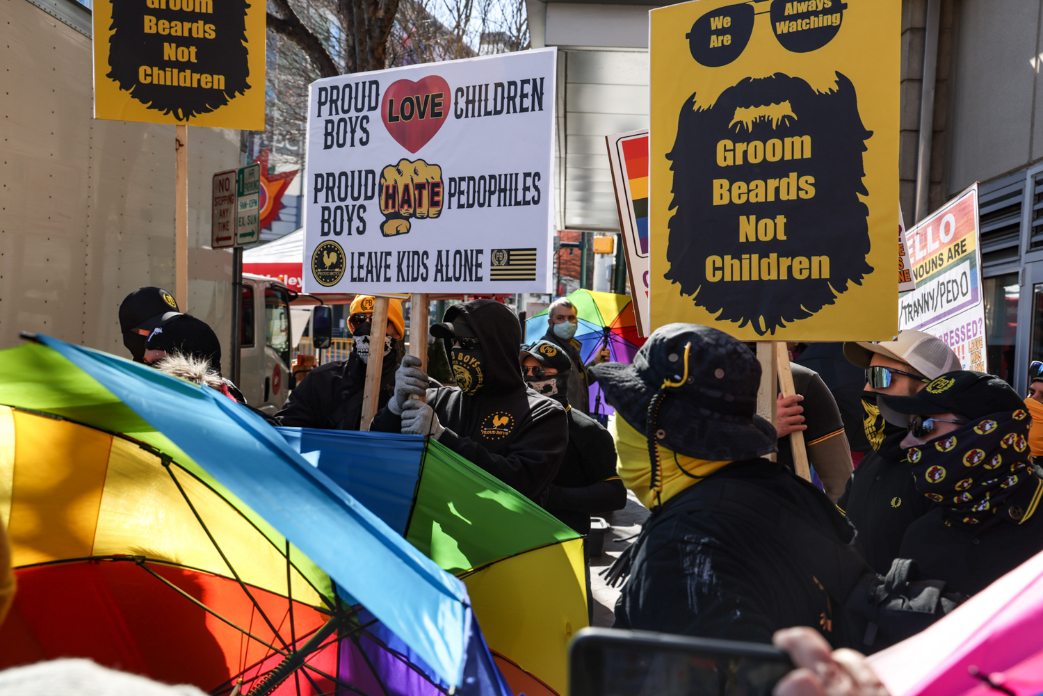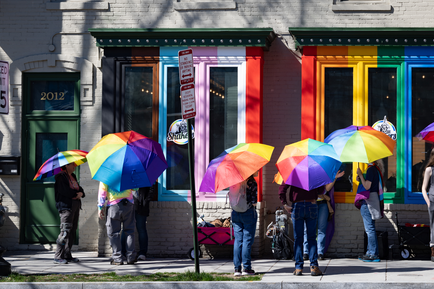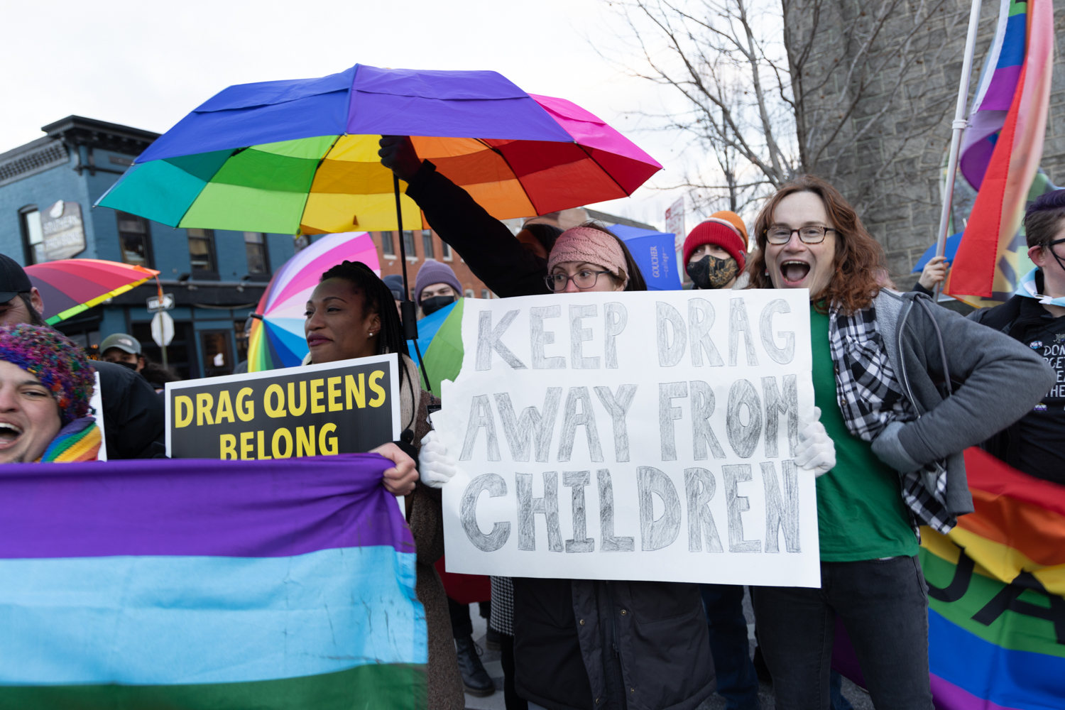Fortunately, protection comes from the Rainbow Defense Coalition - a group of local volunteers who create a shield with rainbow umbrellas and LGBTQ+ flags. Umbrellas/flags, so that the protestors are not seen, and kid-friendly music, so that the protestors are not heard by the children entering