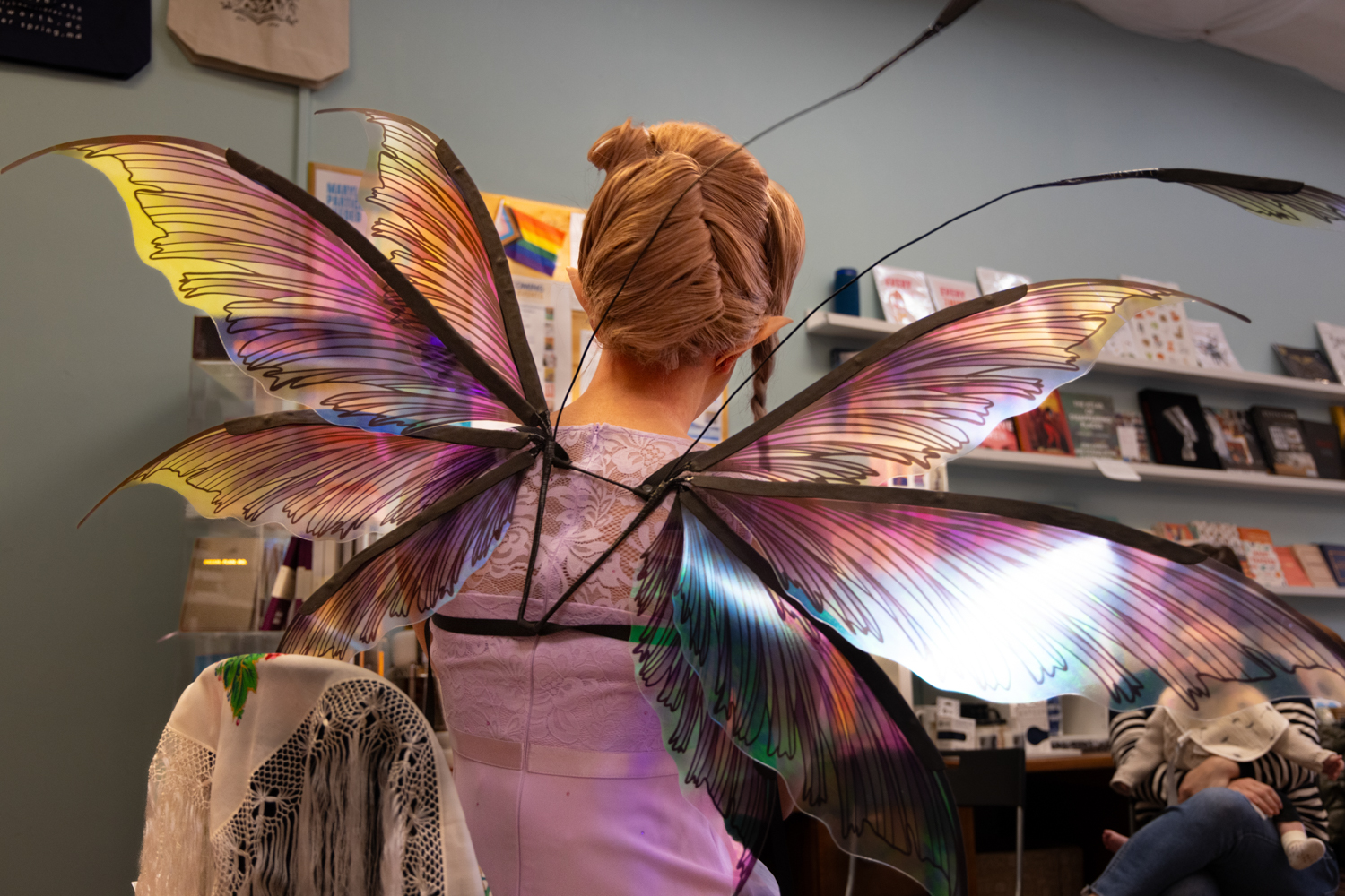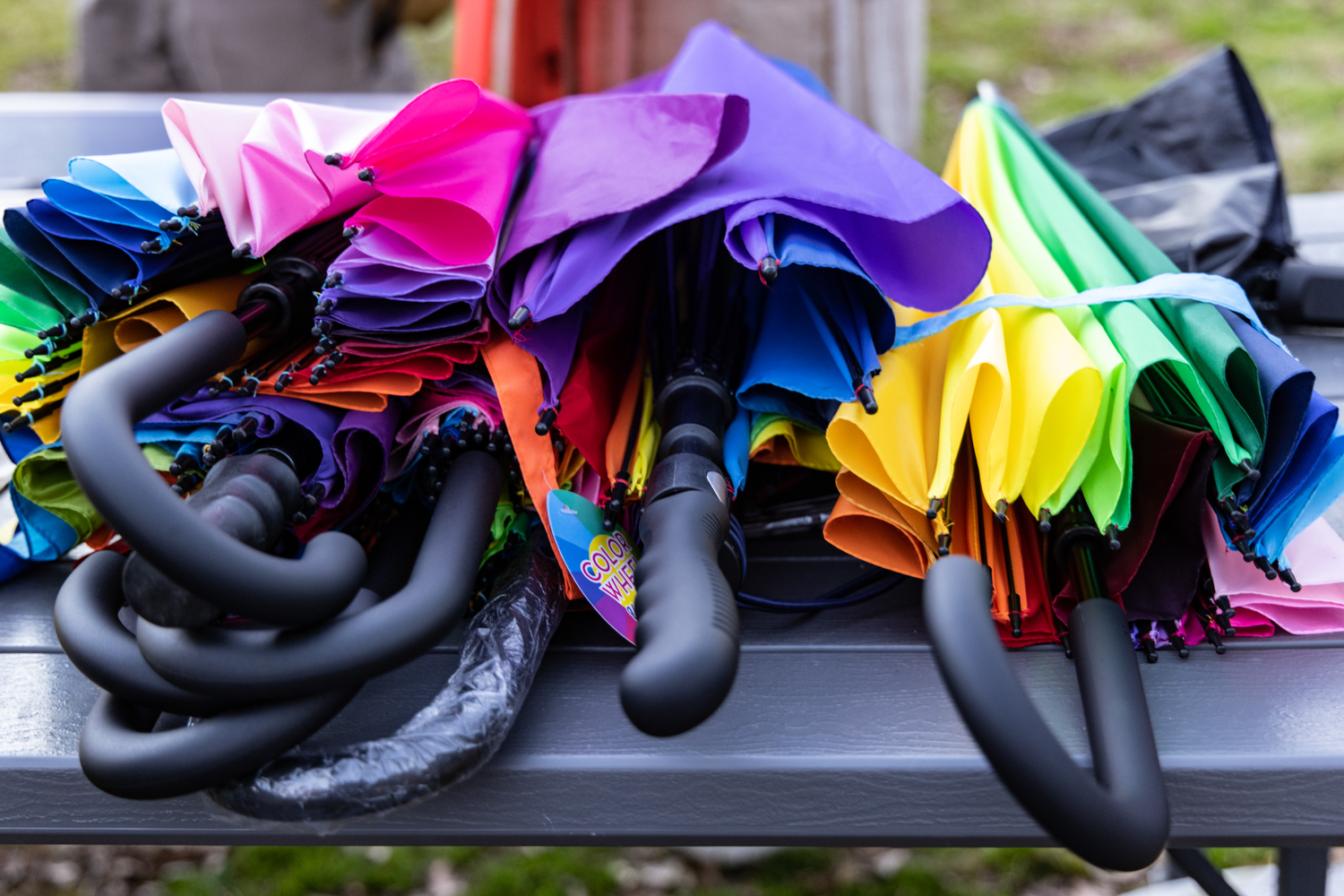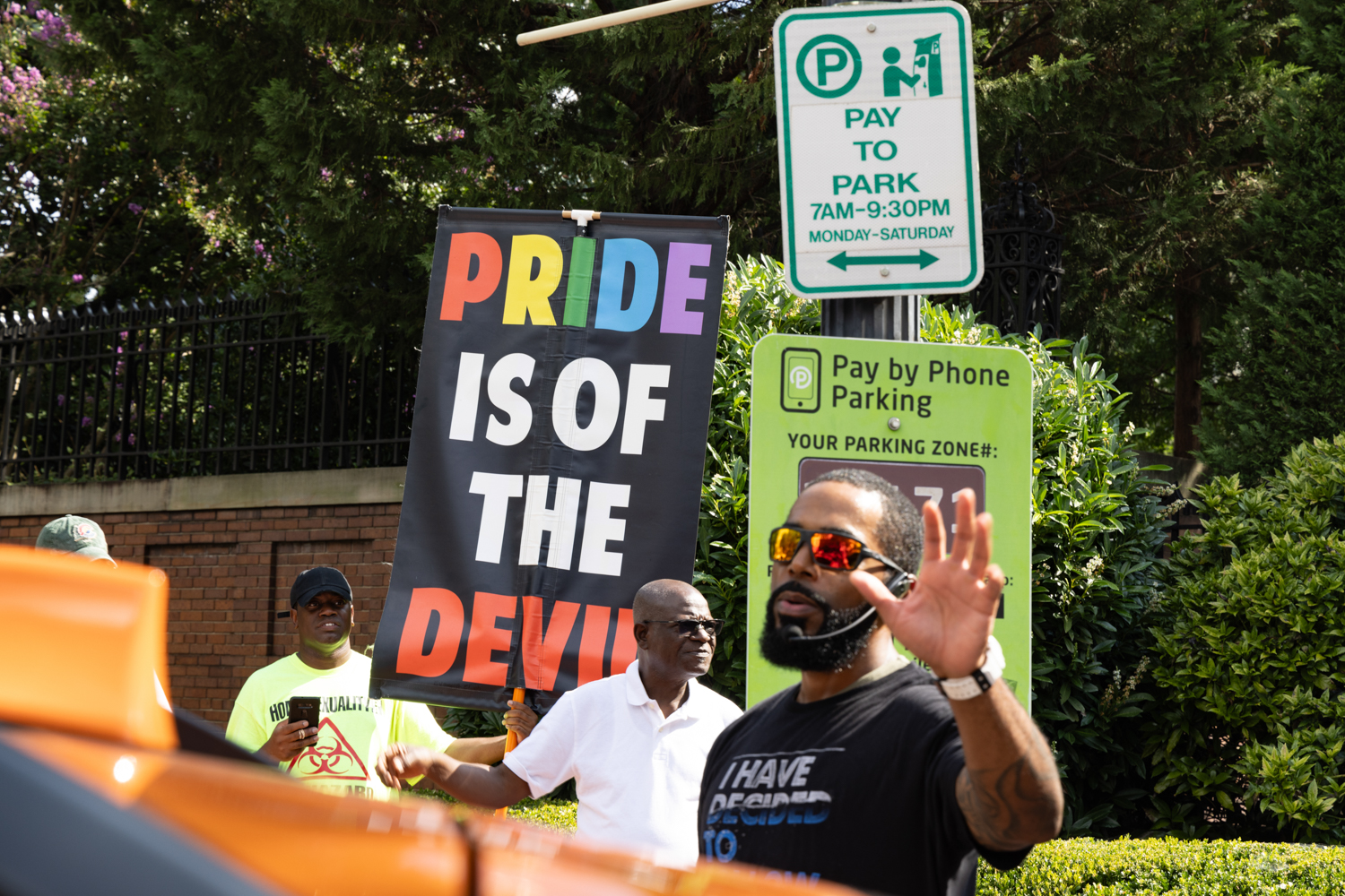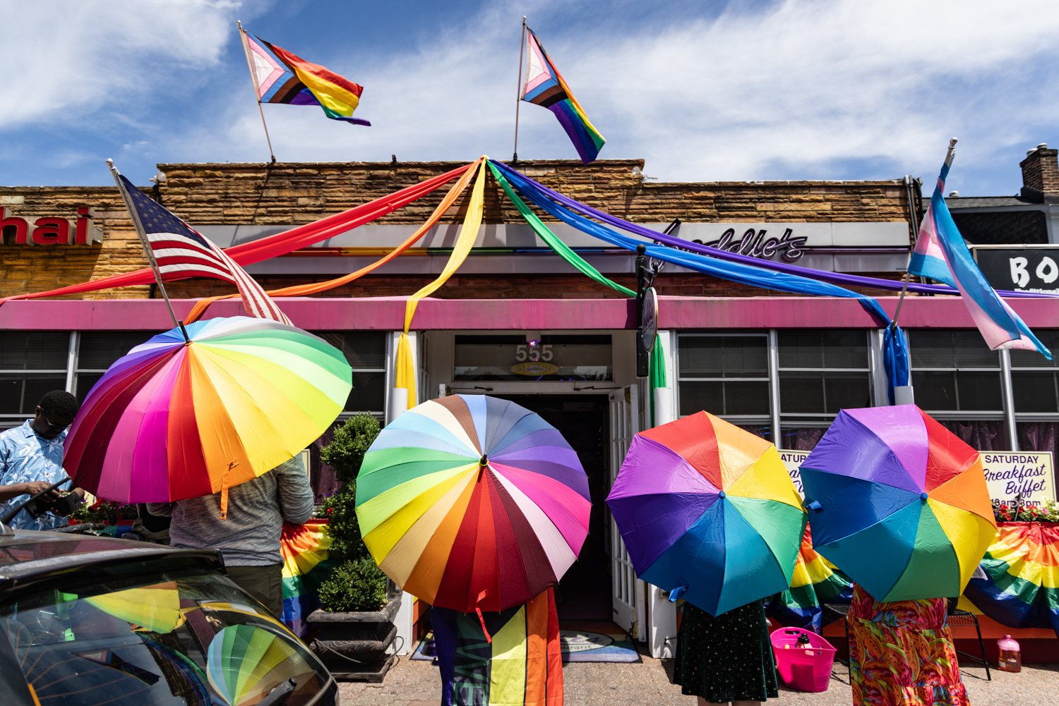 Fortunately, protection comes from the Rainbow Defense Coalition - a group of local volunteers who create a shield with rainbow umbrellas and LGBTQ+ flags. Umbrellas/flags, so that the protestors are not seen, and kid-friendly music, so that the protestors are not heard by the children entering