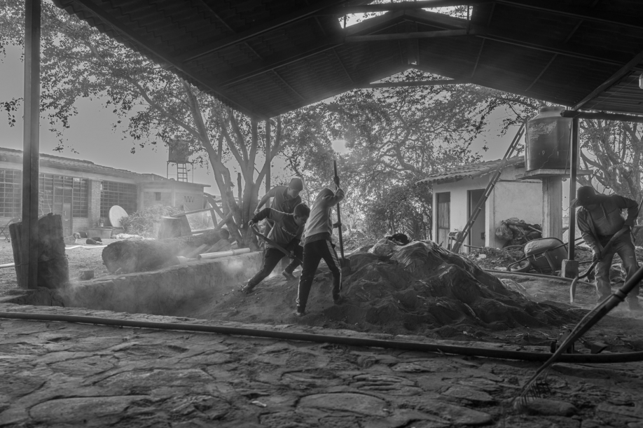 As night falls, frankincense drifts through the shed. A young brujo kneels before the candles and leads prayers and songs shaped by generations of belief and labor. What follows is not ceremony set apart from work, but woven into the same continuum: agave roasted for days, piñas crushed by hand, mezcal distilled in clay pots over open flames.