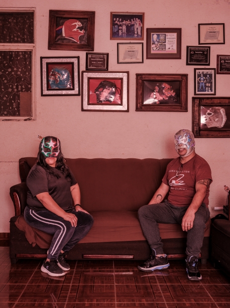 Drabek and Estrellita Queretana, amateur professional wrestlers and partners, sit in the living room of their home in the El Salitre neighborhood of Querétaro, Mexico. Framed masks, trophies, and certificates won by Drabek throughout his wrestling career hang on the wall behind them. October 12, 2025.