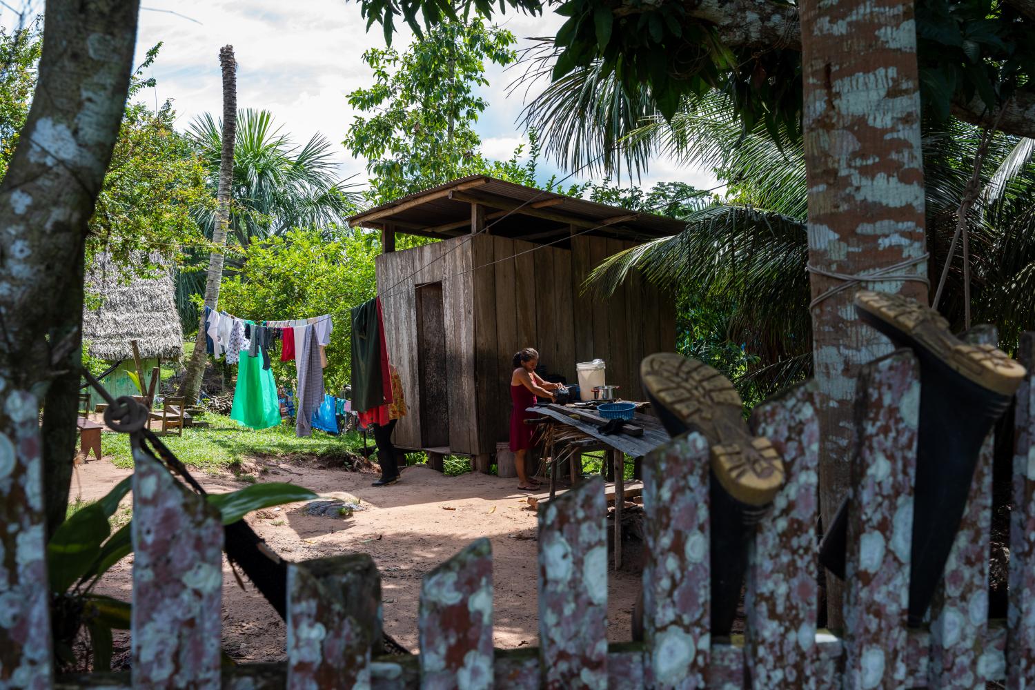 Marlith Mandruma Florès washes dishes outside her family's cooking hut. With no refrigeration, each meal is cooked from scratch with river water. The diet here consists mainly of animal protein and potatoes or plantains. Few people have vegetable gardens and instead farm crops that they can sell, like yucca, cocoa, and banana. Santa Rosillo, San Martin, Peru, December 8, 2022.