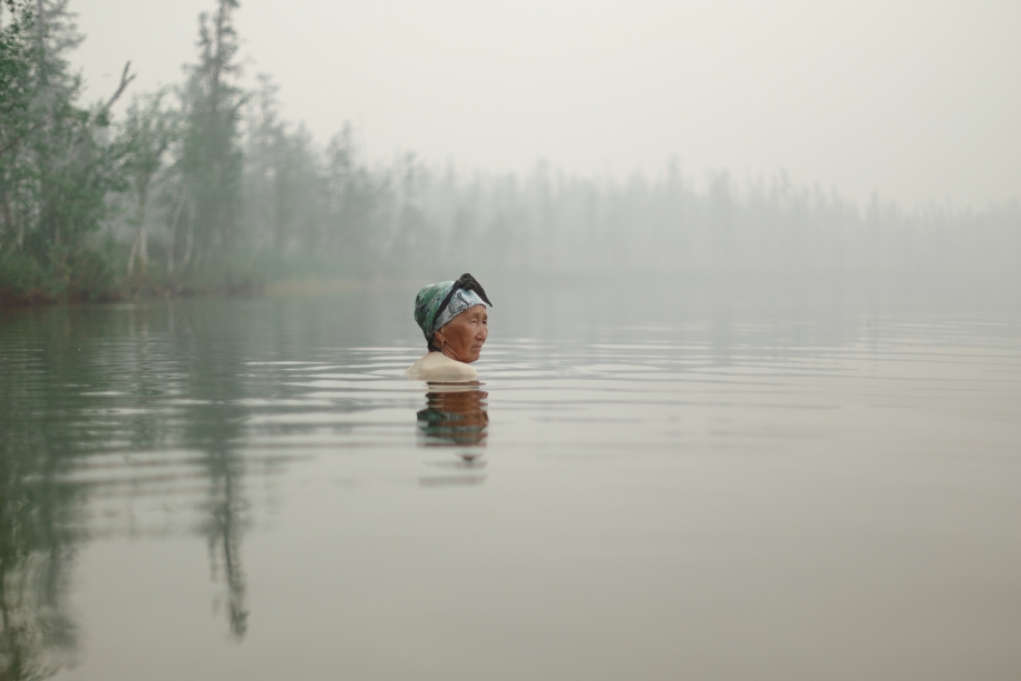 Irina bathes in Lake Sordonnok, 10 kilometers from Betyung. Behind her, the smoke of a forest fire rises, casting a surreal pall over the scene. August 8, 2017. Her grandmother holds the lake in reverence, claiming its waters to be pure and mineral-rich. Foreign scientists have visited the site to study its composition. Now, the once-lush surroundings are barren, the forest nearly consumed by flames.