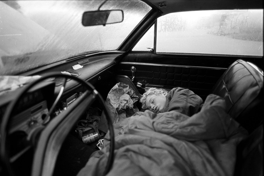 1985 - Ventura, California, USA: Homeless, 11-year-old Kevin sleeps in the front seat of the family car. His 13-year-old brother, Christopher, sleeps in the back. The Wallace family has been homeless for two years. They live at McGrath State Park on the beach. Families are allowed to camp for 14 days and then must leave for 24 hours. “This has not been an easy life on the kids,” says their mom, “The other kids call them hobos.”