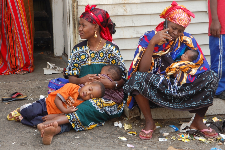 Mothers at work. A gathering to celebrate anther wedding was held outside some apartments. These two mothers were watching the children while a big pot of rice was being prepared on an outside stove. The boys just collapsed in their arms. Poplar Grove, a suburb of Salt Lake City, 2009