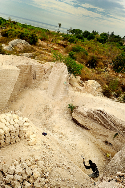 At a remote quarry along a coastal road, men wield heavy picks under hot sun to chisel out bricks from white stone. Most work barefoot, in shredded clothes, while breathing white dust. Each afternoon a truck collects their bricks. On a good day, men produce 30 bricks in six hours, earning 300 schillings, or about $3.75 for this back-breaking work..