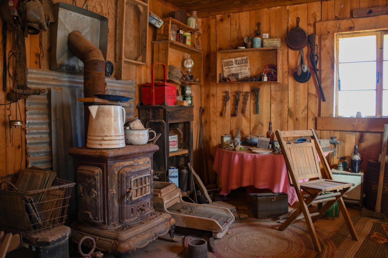 Miner's Hearth -- The humble kitchen and living area anchor's a miner's existence. An indispensible cast-iron stove serves as the room's practical center. The scene conveys the self-sufficiency and resilience inherent to prospectors carving out a simple home in the remote Arizona high desert.